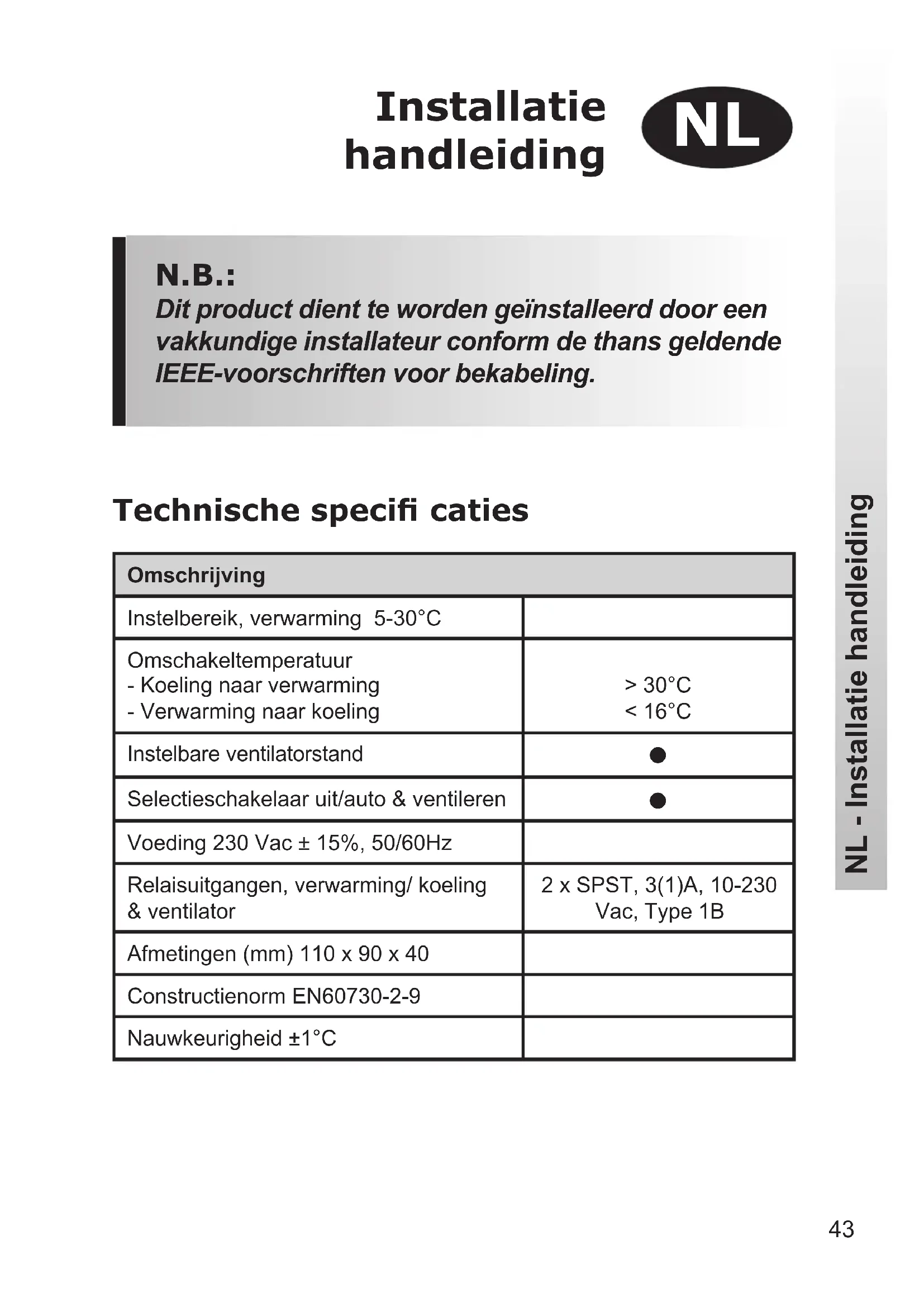 NL - Installatie handleiding OmschrijvingInstelbereik, verwarming 5-30°COmschakeltemperatuur - Koeling naar verwarming- Verwarming naar koeling> 30°C< 16°CInstelbare ventilatorstand Selectieschakelaar uit/auto & ventileren Voeding 230 Vac ± 15%, 50/60HzRelaisuitgangen, verwarming/ koeling & ventilator2 x SPST, 3(1)A, 10-230 Vac, Type 1BAfmetingen (mm) 110 x 90 x 40Constructienorm EN60730-2-9Nauwkeurigheid ±1°C Technische specifi caties44 NL - Installatie handleiding Productoverzicht De thermostaat is ontworpen voor systemen met fancoils en een centrale omschakeling van koelen naar verwarmen. De thermostaat regelt een afsluiter. De afsluiter opent bij warmtevraag als de thermostaat in de verwarmingsstand staat en bij koelvraag als de thermostaat in de koelstand staat. De overschakeling van verwarmen naar koelen gaat automatisch m.b.v. een temperatuursensor op de aanvoerleiding. Wanneer de aanvoertemperatuur hoger is dan 30 °C werkt de thermostaat als een verwarmingsthermostaat, wanneer de aanvoertemperatuur lager is dan 16 °C werkt de thermostaat als koelthermostaat. Belangrijke opmerking: Het is belangrijk dat de leidingsensor wordt gemonteerd op een plek waar altijd stroming is. Hierdoor kan het noodzakelijk zijn om een kortsluitleiding te monteren aan het eind van elke strang. Montage Verwijder eerst de grondplaat aan de achterkant van de thermostaat.. Monteer de grondplaat op een hoogte van ca. 1,5 m vanaf de vloer, niet op de tocht en uit de buurt van warmtebronnen zoals radiatoren, open haard of direct zonlicht. !45 Rondom de thermostaat dient een vrije ruimte van minimaal 140 mm te worden aangehouden. Locatie van de pijpsensor Bevestig de leidingsensor op de aanvoerleiding met behulp van de meegeleverde klemband.Belangrijke opmerking: Het is belangrijk dat de leidingsensor wordt gemonteerd op een plek waar altijd stroming is. Hierdoor kan het noodzakelijk zijn om een kortsluitleiding te monteren aan het eind van elke strang.