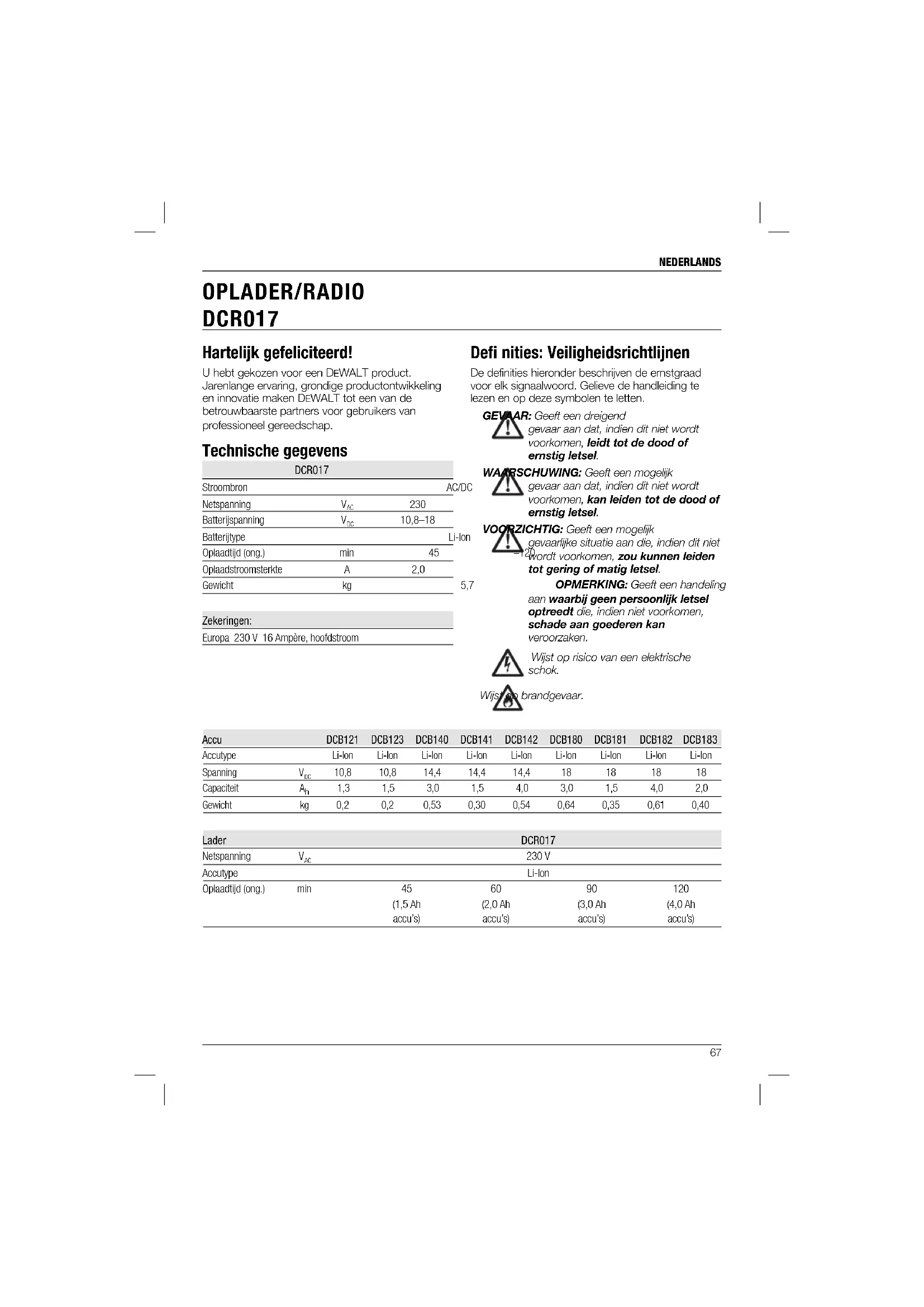 - De DCR017 oplader/radio is ontworpen om te worden gebruikt op standaard 230 V huishoudstroom. Probeer de oplader niet op enig ander voltage uit. Dit geldt niet voor de transportoplader.