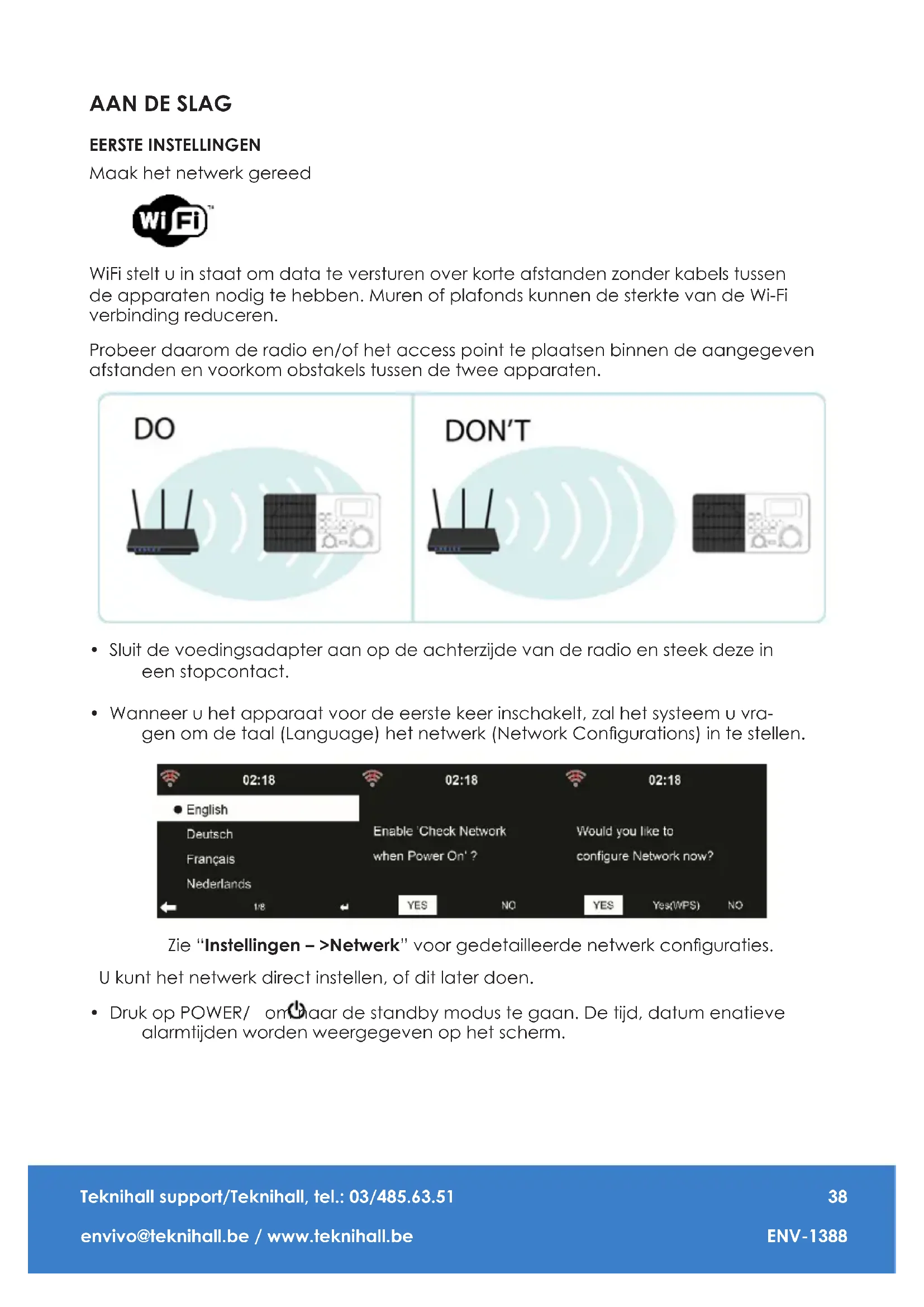 - Netwerk detecteren bij inschakelen Het WiFi netwerk inschakelen/uitschakelen. Wanneer u de radio inschakelt zal deze automatisch verbinden met het laatste WiFi netwerk wanneer Check Network when Power On is ingeschakeld.Teknihall support/Teknihall, tel.: 03/485.63.51 envivo@teknihall.be / www.teknihall.be ENV-1388