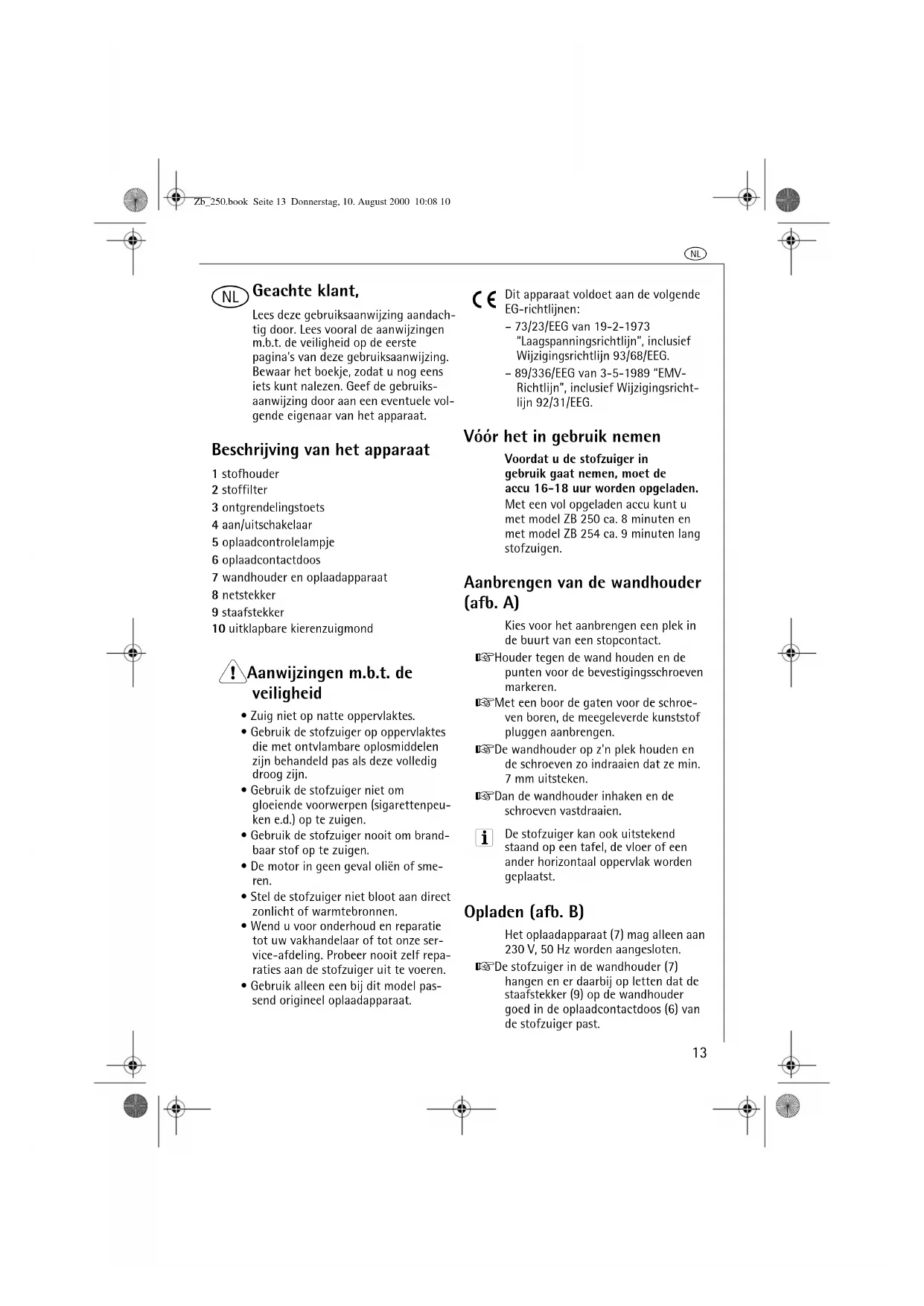 - Stel de stofzuiger niet bloot aan direct zonlicht of warmtebronnen.• Wend u voor onderhoud en reparatie tot uw vakhandelaar of tot onze ser-vice-afdeling. Probeer nooit zelf repa-raties aan de stofzuiger uit te voeren.• Gebruik alleen een bij dit model pas-send origineel oplaadapparaat. Dit apparaat voldoet aan de volgende EG-richtlijnen: – 73/23/EEG van 19-2-1973 “Laagspanningsrichtlijn”, inclusief Wijzigingsrichtlijn 93/68/EEG.– 89/336/EEG van 3-5-1989 “EMV-Richtlijn”, inclusief Wijzigingsricht-lijn 92/31/EEG. Vóór het in gebruik nemen Voordat u de stofzuiger in gebruik gaat nemen, moet de accu 16-18 uur worden opgeladen.Met een vol opgeladen accu kunt u met model ZB 250 ca. 8 minuten en met model ZB 254 ca. 9 minuten lang stofzuigen. Aanbrengen van de wandhouder (afb. A) Kies voor het aanbrengen een plek in de buurt van een stopcontact.0 Houder tegen de wand houden en de punten voor de bevestigingsschroeven markeren. 0 Met een boor de gaten voor de schroe-ven boren, de meegeleverde kunststof pluggen aanbrengen.0 De wandhouder op z'n plek houden en de schroeven zo indraaien dat ze min. 7 mm uitsteken.0 Dan de wandhouder inhaken en de schroeven vastdraaien. De stofzuiger kan ook uitstekend staand op een tafel, de vloer of een ander horizontaal oppervlak worden geplaatst. Opladen (afb. B) Het oplaadapparaat (7) mag alleen aan 230 V, 50 Hz worden aangesloten. 0 De stofzuiger in de wandhouder (7) hangen en er daarbij op letten dat de staafstekker (9) op de wandhouder goed in de oplaadcontactdoos (6) van de stofzuiger past. Zb_250.book Seite 13 Donnerstag, 10. August 2000 10:08 10l