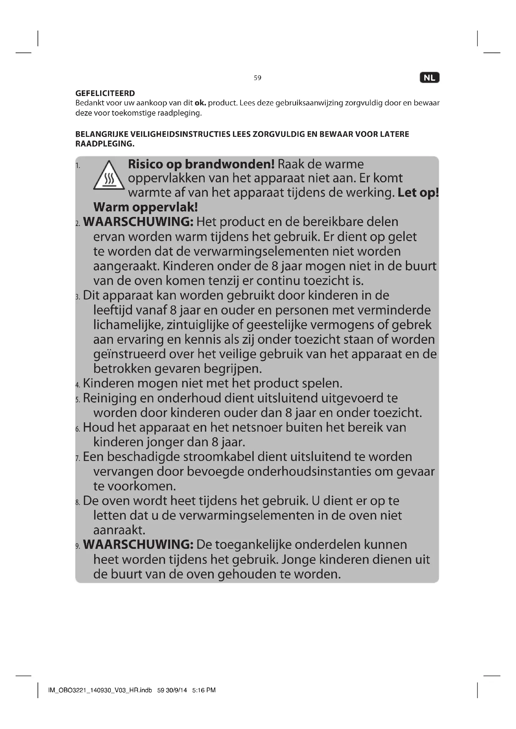 heet worden tijdens het gebruik. Jonge kinderen dienen uit de buurt van de oven gehouden te worden. IM_OBO3221_140930_V03_HR.indb 59 30/9/14 5:16 PM60