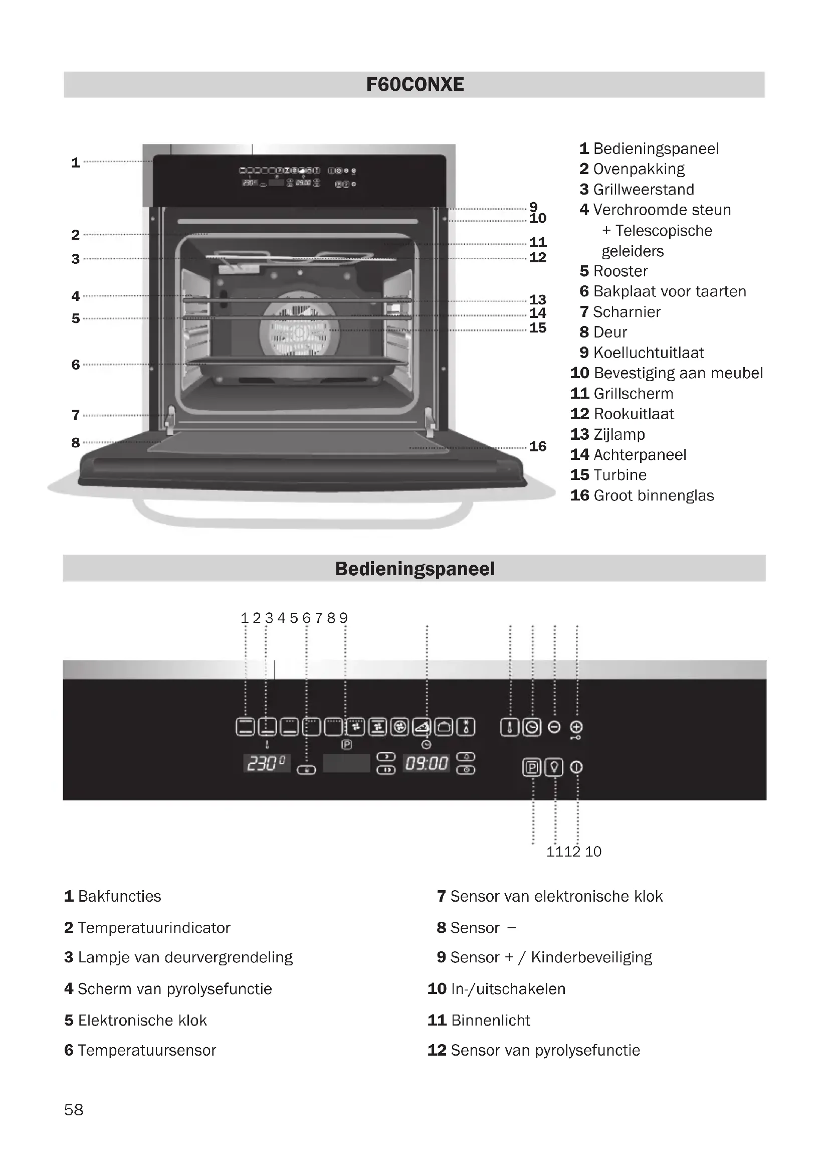 F60CONXE 1 Bakfuncties 2 Temperatuurindicator 3 Lampje van deurvergrendeling 4 Scherm van pyrolysefunctie 5 Elektronische klok 6 Temperatuursensor Bedieningspaneel 7 Sensor van elektronische klok 8 Sensor