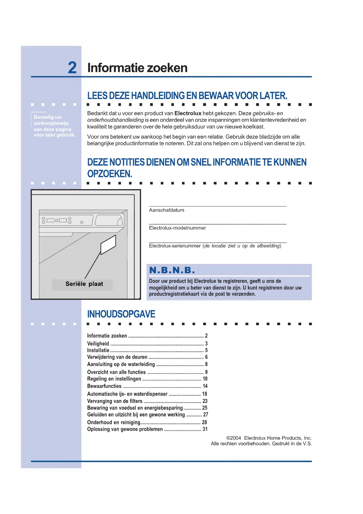 - Se Underhålls- och rengöringstips. Täck över maten ordentligt.241595800 (0504) Use & Care Guide Side-By-Side Refrigerator Guía de uso y cuidado Refrigerador de dos puertas Guide d’utilisation et d’entretien Réfrigérateur à compartiments juxtaposés Gebrauchs- & Pflegeanleitung Doppeltür-Kühlschrank Ïäçãßåò ÷ñÞóçò êáé öñïíôßäáò Øõãåßï äýï èõñþí Manual Bredvidstående kyl/frysskåp Gebruiks- en onderhoudshandleiding Side-by-side koel-/vrieskast Käyttö- ja huolto-ohje Side-By-Side-jääkaappi Manuale d’uso e manutenzione Frigorifero Side-By-Side2 Informatie zoeken LEES DEZE HANDLEIDING EN BEWAAR VOOR LATER. Bedankt dat u voor een product van Electrolux hebt gekozen. Deze gebruiks- en onderhoudshandleiding is een onderdeel van onze inspanningen om klantentevredenheid enkwaliteit te garanderen over de hele gebruiksduur van uw nieuwe koelkast.Voor ons betekent uw aankoop het begin van een relatie. Gebruik deze bladzijde om allebelangrijke productinformatie te noteren. Dit zal ons helpen om u blijvend van dienst te zijn. DEZE NOTITIES DIENEN OM SNEL INFORMATIE TE KUNNEN OPZOEKEN. ________________________________________________Aanschafdatum________________________________________________Electrolux-modelnummer________________________________________________Electrolux-serienummer (de locatie ziet u op de afbeelding)©2004 Electrolux Home Products, Inc.Alle rechten voorbehouden. Gedrukt in de V.S. N.B.N.B. N.B.N.B. N.B. Door uw product bij Electrolux te registreren, geeft u ons demogelijkheid om u beter van dienst te zijn. U kunt registreren door uwproductregistratiekaart via de post te verzenden.Bevestig uwaankoopbewijsaan deze paginavoor later gebruik. INHOUDSOPGAVE Informatie zoeken ........................................................... 2 Veiligheid ......................................................................... 3 Installatie ......................................................................... 5 Verwijdering van de deuren ........................................... 6 Aansluiting op de waterleiding ..................................... 8 Overzicht van alle functies ............................................ 9 Regeling en instellingen .............................................. 10 Bewaarfuncties ............................................................. 14 Automatische ijs- en waterdispenser ......................... 18 Vervanging van de filters ............................................. 23 Bewaring van voedsel en energiebesparing ............. 25Geluiden en uitzicht bij een gewone werking ............ 27Onderhoud en reiniging............................................... 28 Oplossing van gewone problemen ............................. 31 Seriële plaat3 Veiligheid BELANGRIJKE VEILIGHEIDSINSTRUCTIES Algemene veiligheid