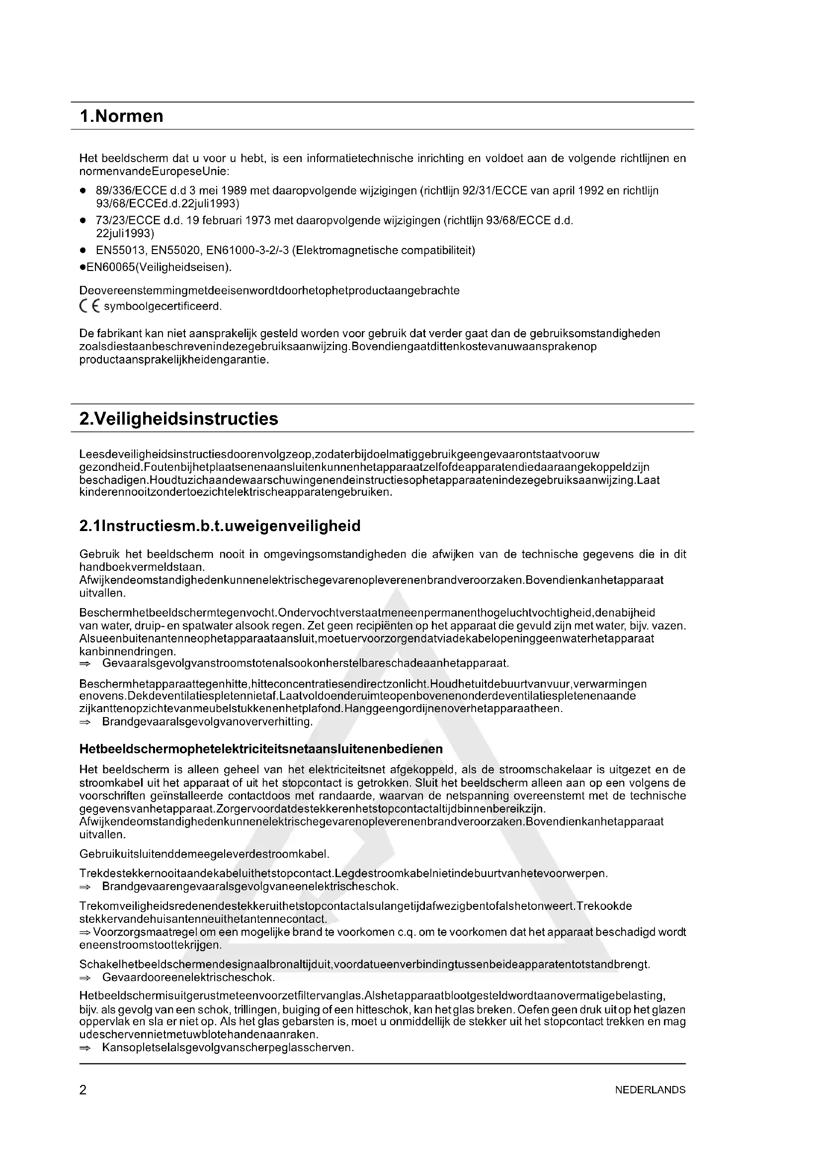 Het beeldscherm dat u voor u hebt, is een informatietechnische inrichting en voldoet aan de volgende richtlijnen en normen van de Europese Unie: D 89/336/ECCE d.d 3 mei 1989 met daaropvolgende wijzigingen (richtlijn 92/31/ECCE van april 1992 en richtlijn 93/68/ECCE d.d. 22 juli 1993) D 73/23/ECCE d.d. 19 februari 1973 met daaropvolgende wijzigingen (richtlijn 93/68/ECCE d.d. 22 juli 1993) D EN55013, EN55020, EN61000-3-2/-3 (Elektromagnetische compatibiliteit) D EN60065 (Veiligheidseisen). De overeenstemming met de eisen wordt door het op het product aangebrachte symbool gecertificeerd. De fabrikant kan niet aansprakelijk gesteld worden voor gebruik dat verder gaat dan de gebruiksomstandigheden zoals die staan beschreven in deze gebruiksaanwijzing. Bovendien gaat dit ten koste van uw aanspraken op productaansprakelijkheid en garantie.