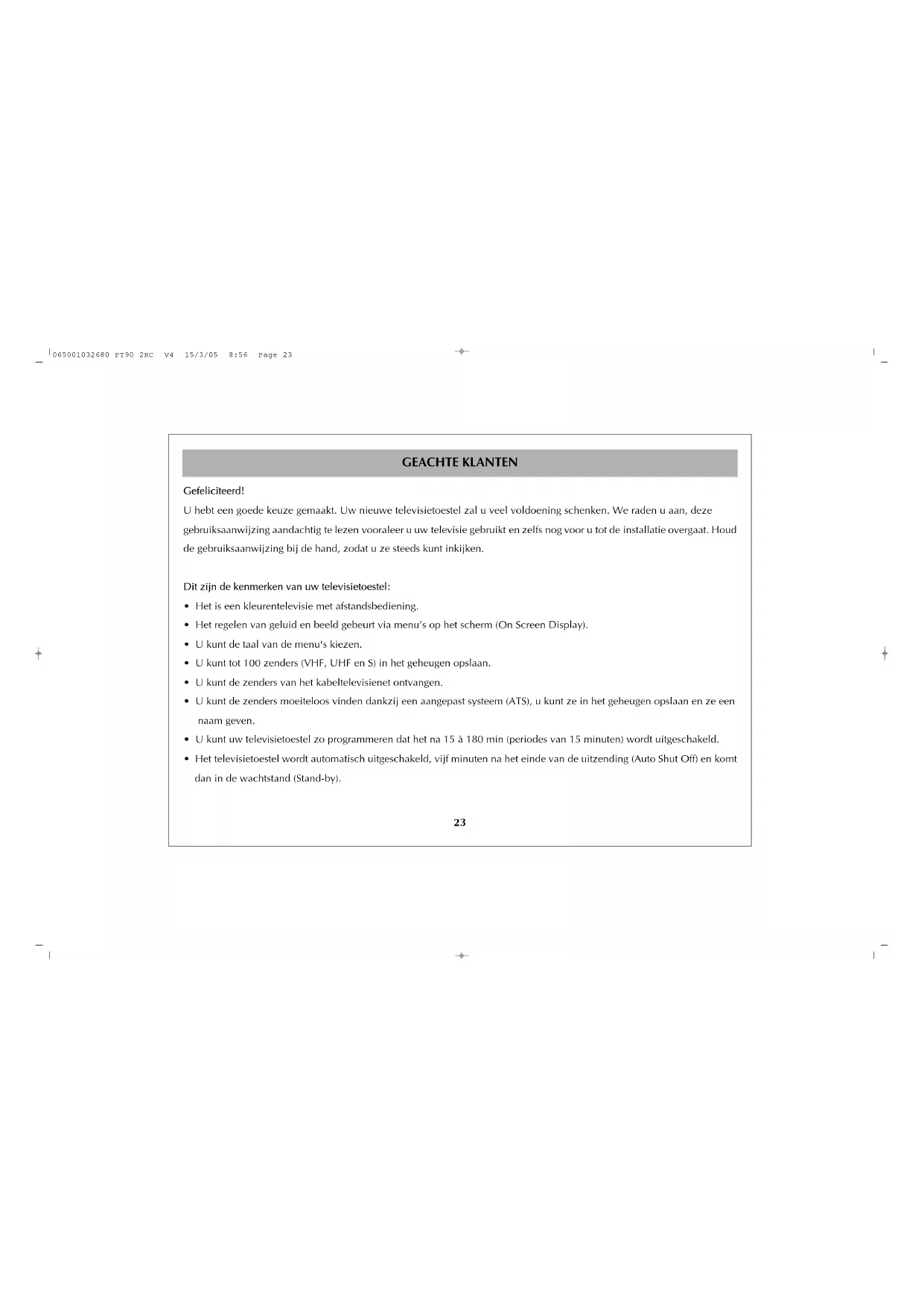 - Het televisietoestel wordt automatisch uitgeschakeld, vijf minuten na het einde van de uitzending (Auto Shut Off) en komt dan in de wachtstand (Stand-by). 065001032680 PT90 2RC V4 15/3/05 8:56 Page 23VOOR EEN VEILIG GEBRUIK VAN UW TELEVISIETOESTEL