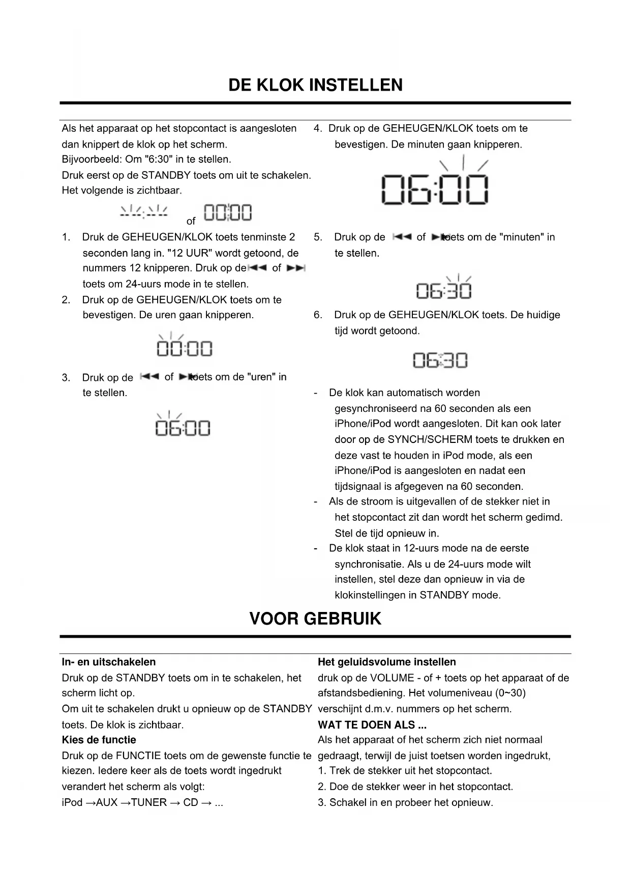tijd wordt getoond. - De klok kan automatisch worden gesynchroniseerd na 60 seconden als een iPhone/iPod wordt aangesloten. Dit kan ook later door op de SYNCH/SCHERM toets te drukken en deze vast te houden in iPod mode, als een iPhone/iPod is aangesloten en nadat een tijdsignaal is afgegeven na 60 seconden. - Als de stroom is uitgevallen of de stekker niet in het stopcontact zit dan wordt het scherm gedimd. Stel de tijd opnieuw in. - De klok staat in 12-uurs mode na de eerste synchronisatie. Als u de 24-uurs mode wilt instellen, stel deze dan opnieuw in via de klokinstellingen in STANDBY mode. VOOR GEBRUIK In- en uitschakelen Druk op de STANDBY toets om in te schakelen, het scherm licht op. Om uit te schakelen drukt u opnieuw op de STANDBY toets. De klok is zichtbaar. Kies de functie Druk op de FUNCTIE toets om de gewenste functie te kiezen. Iedere keer als de toets wordt ingedrukt verandert het scherm als volgt: iPod →AUX →TUNER → CD → ... Het geluidsvolume instellen druk op de VOLUME - of + toets op het apparaat of de afstandsbediening. Het volumeniveau (0~30) verschijnt d.m.v. nummers op het scherm. WAT TE DOEN ALS ... Als het apparaat of het scherm zich niet normaal gedraagt, terwijl de juist toetsen worden ingedrukt,
