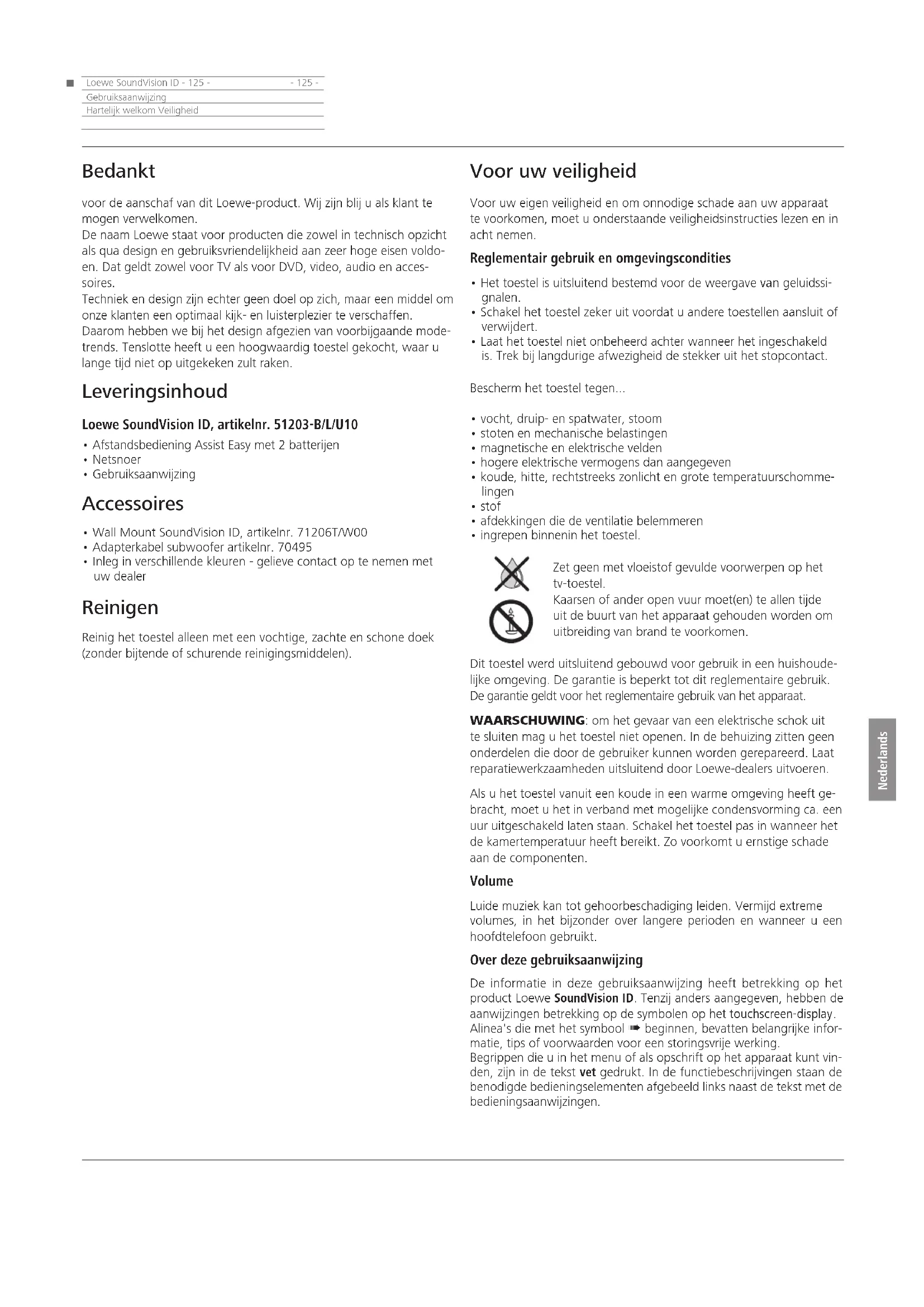 - 125 -GebruiksaanwijzingHartelijk welkom Veiligheid Bedankt voor de aanschaf van dit Loewe-product. Wij zijn blij u als klant te mogen verwelkomen. De naam Loewe staat voor producten die zowel in technisch opzicht als qua design en gebruiksvriendelijkheid aan zeer hoge eisen voldo- en. Dat geldt zowel voor TV als voor DVD, video, audio en acces- soires. Techniek en design zijn echter geen doel op zich, maar een middel om onze klanten een optimaal kijk- en luisterplezier te verschaffen. Daarom hebben we bij het design afgezien van voorbijgaande mode- trends. Tenslotte heeft u een hoogwaardig toestel gekocht, waar u lange tijd niet op uitgekeken zult raken. Leveringsinhoud Loewe SoundVision ID, artikelnr. 51203-B/L/U10