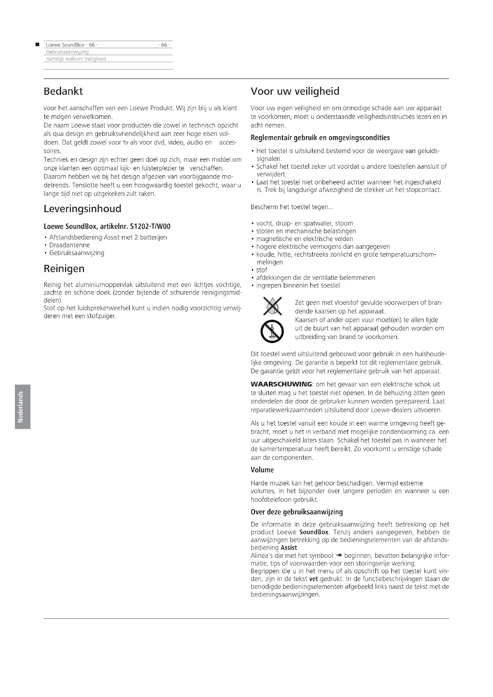 - 66 -GebruiksaanwijzingHartelijk welkom Veiligheid Bedankt voor het aanschaffen van een Loewe Produkt. Wij zijn blij u als klant te mogen verwelkomen. De naam Loewe staat voor producten die zowel in technisch opzicht als qua design en gebruiksvriendelijkheid aan zeer hoge eisen vol- doen. Dat geldt zowel voor tv als voor dvd, video, audio en acces- soires. Techniek en design zijn echter geen doel op zich, maar een middel om onze klanten een optimaal kijk- en luisterplezier te verschaffen. Daarom hebben we bij het design afgezien van voorbijgaande mo- detrends. Tenslotte heeft u een hoogwaardig toestel gekocht, waar u lange tijd niet op uitgekeken zult raken. Leveringsinhoud Loewe SoundBox, artikelnr. 51202-T/W00