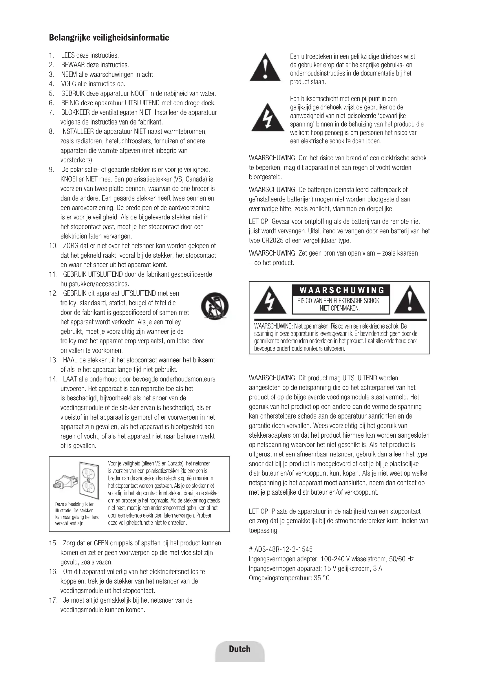 6Voor je veiligheid (alleen VS en Canada): het netsnoer is voorzien van een polarisatiestekker (de ene pen is breder dan de andere) en kan slechts op één manier in het stopcontact worden gestoken. Als je de stekker niet volledig in het stopcontact kunt steken, draai je de stekker om en probeer je het nogmaals. Als de stekker nog steeds niet past, moet je een ander stopcontact gebruiken of het door een erkende elektricien laten vervangen. Probeer deze veiligheidsfunctie niet te omzeilen. Een uitroepteken in een gelijkzijdige driehoek wijst de gebruiker erop dat er belangrijke gebruiks- en onderhoudsinstructies in de documentatie bij het product staan. Een bliksemschicht met een pijlpunt in een gelijkzijdige driehoek wijst de gebruiker op de aanwezigheid van niet-geïsoleerde ‘gevaarlijke spanning’ binnen in de behuizing van het product, die wellicht hoog genoeg is om personen het risico van een elektrische schok te doen lopen. WAARSCHUWING: Om het risico van brand of een elektrische schok te beperken, mag dit apparaat niet aan regen of vocht worden blootgesteld. WAARSCHUWING: De batterijen (geïnstalleerd batterijpack of geïnstalleerde batterijen) mogen niet worden blootgesteld aan overmatige hitte, zoals zonlicht, vlammen en dergelijke. LET OP: Gevaar voor ontploffing als de batterij van de remote niet juist wordt vervangen. Uitsluitend vervangen door een batterij van het type CR2025 of een vergelijkbaar type. WAARSCHUWING: Zet geen bron van open vlam – zoals kaarsen – op het product. Important Safety Information