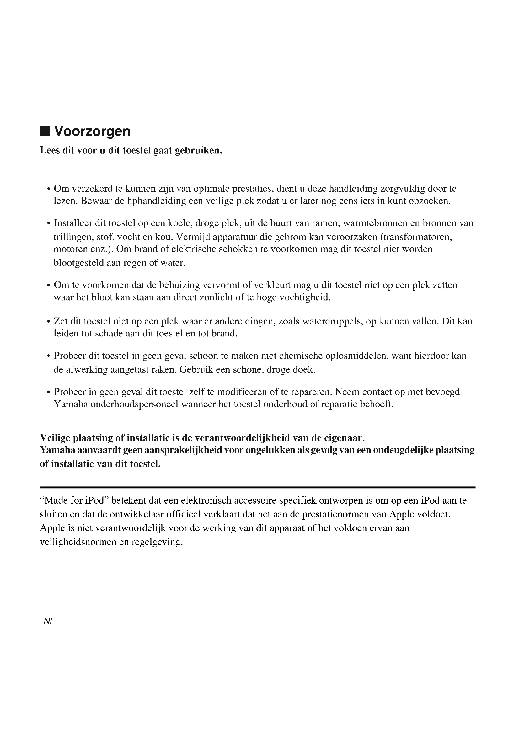- Probeer in geen geval dit toestel zelf te modificeren of te repareren. Neem contact op met bevoegd Yamaha onderhoudspersoneel wanneer het toestel onderhoud of reparatie behoeft. Veilige plaatsing of installatie is de verantwoordelijkheid van de eigenaar. Yamaha aanvaardt geen aansprakelijkheid voor ongelukken als gevolg van een ondeugdelijke plaatsing of installatie van dit toestel. ■ Voorzorgen