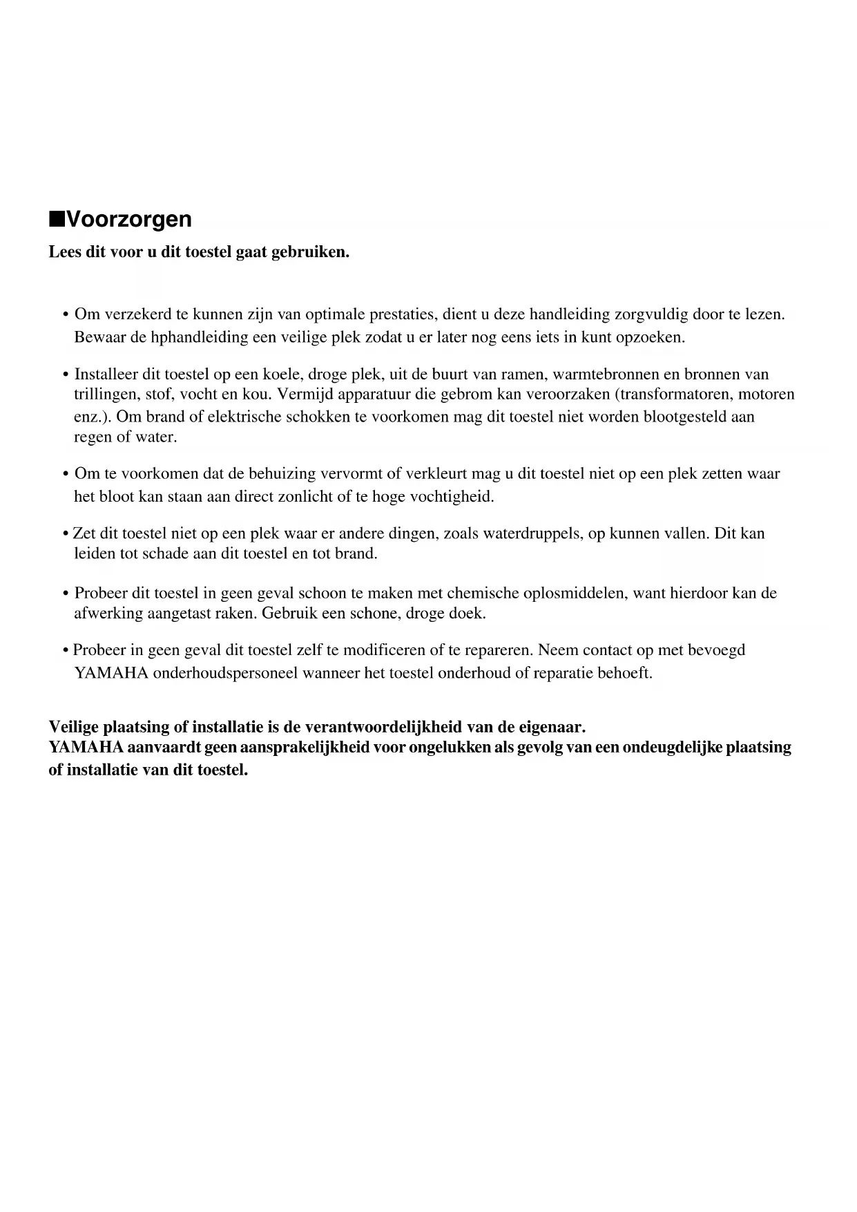 - Installeer dit toestel op een koele, droge plek, uit de buurt van ramen, warmtebronnen en bronnen van trillingen, stof, vocht en kou. Vermijd apparatuur die gebrom kan veroorzaken (transformatoren, motoren enz.). Om brand of elektrische schokken te voorkomen mag dit toestel niet worden blootgesteld aan regen of water.