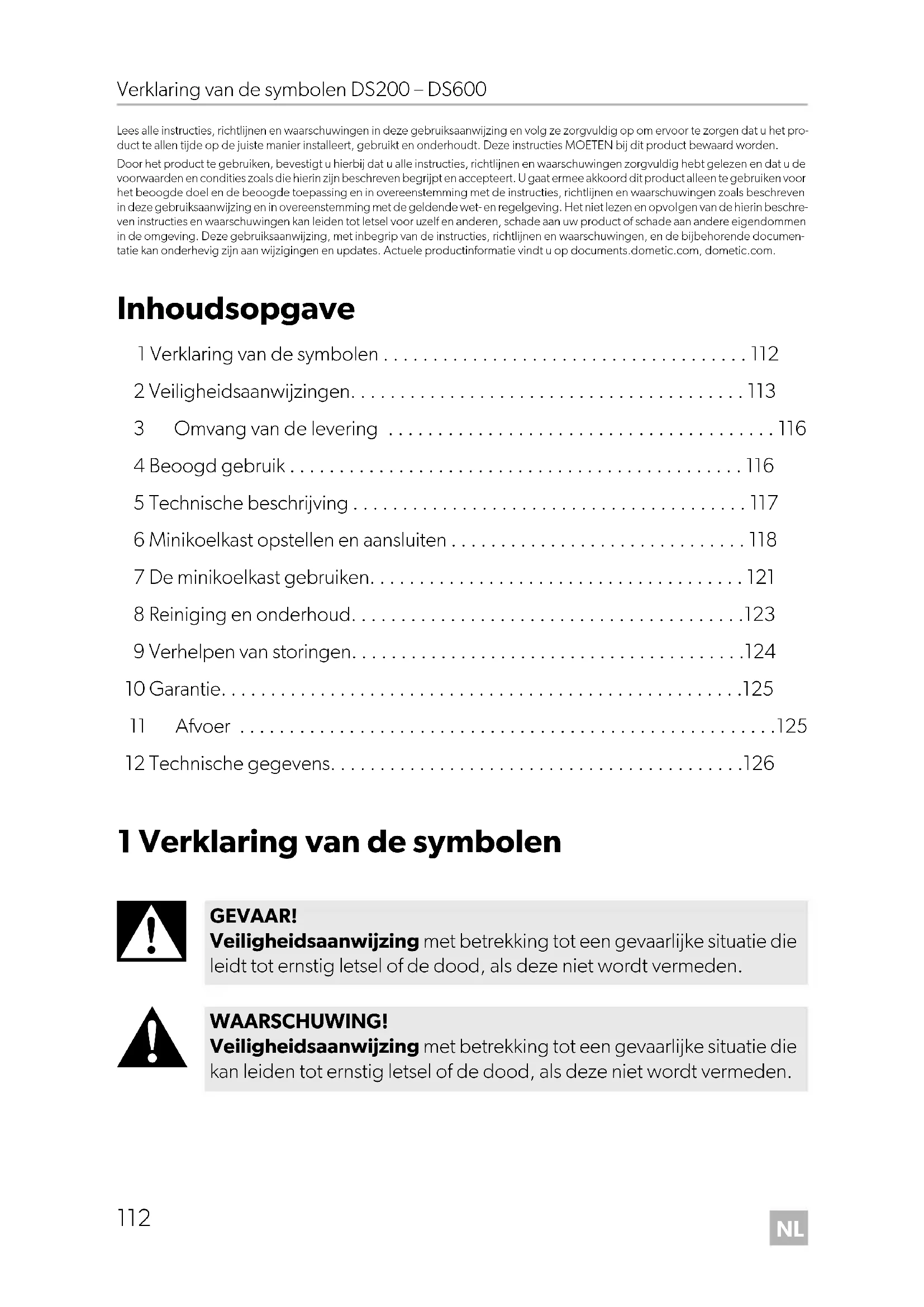 - Bewaar geen explosiegevaarlijke stoffen, zoals spuitbussen met brandbaar drijfgas, in de minikoelkast. VOORZICHTIG! Veiligheidsaanwijzing met betrekking tot een gevaarlijke situatie die kan leiden tot licht of gemiddeld letsel, als deze niet wordt vermeden. LET OP! Aanwijzing met betrekking tot een situatie die kan leiden tot materiële schade, als deze niet wordt vermeden. INSTRUCTIE Meer informatie over de bediening van het product. DometicDS200-300-400-600_IOM_4445103315_EMEA16_2020-xx-xx.book Seite 113 Mittwoch, 3. März 2021 11:36 11NL Veiligheidsaanwijzingen DS200 – DS600