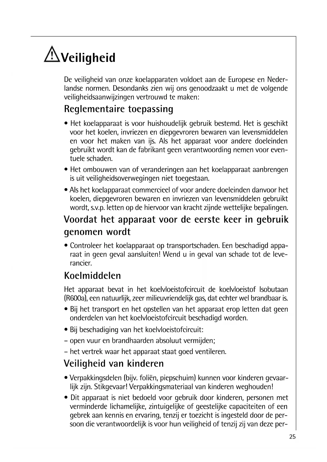 De verilgheit van unsere koelapparaten voldoet aan de Europese en Nederlandse normen. Desondanks zich wij ons genoodzaakt u met de volgende verilgheidsaanwijzingen vertrouwd te make: