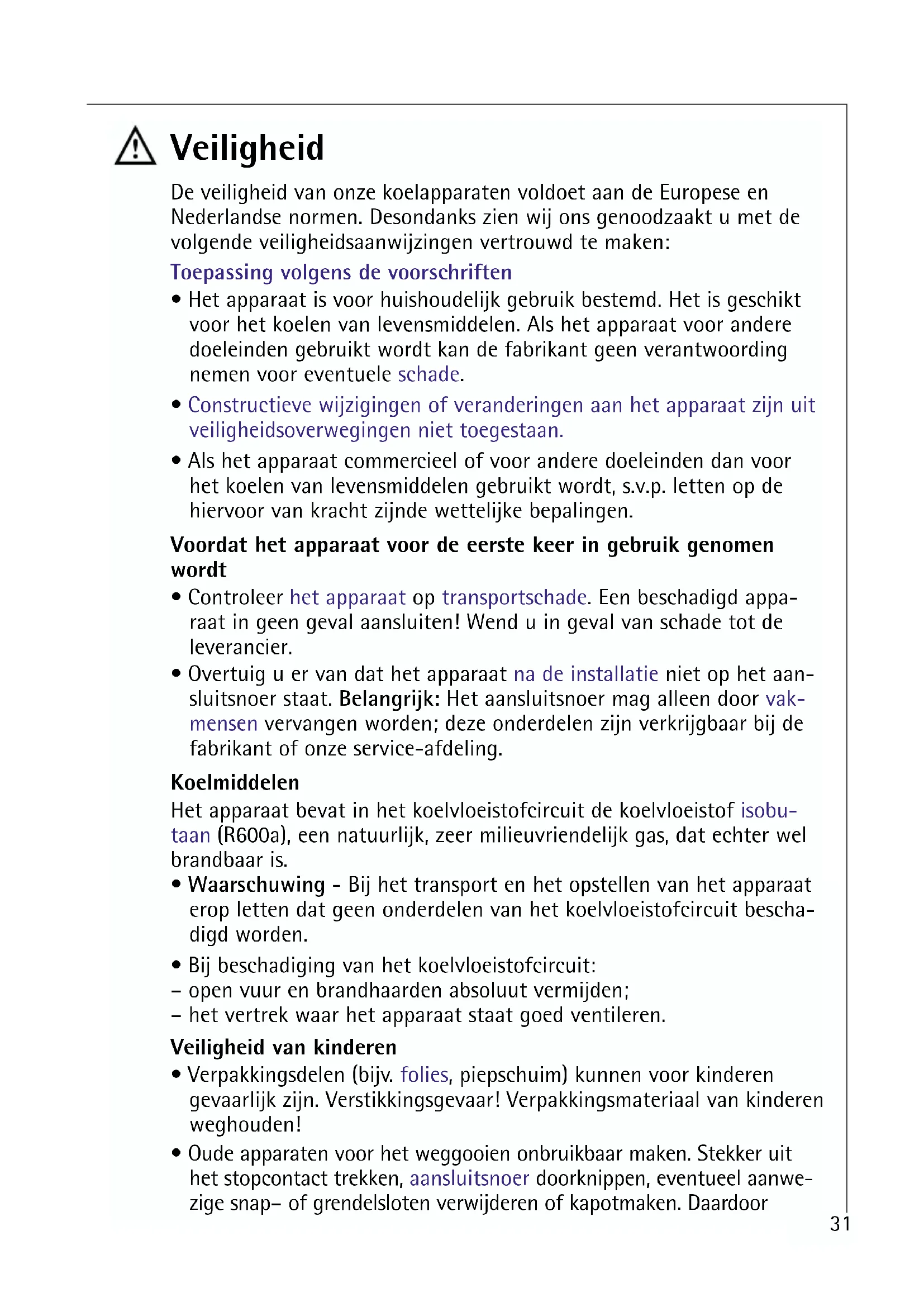 - Condenseur Le condenseur a presque toujours la forme d’une grille. À l’intérieur le fluide réfrigérant comprimé par le compresseur retourne à l’état liqui- de. Pendant ce processus il se produit une libération de chaleur, qui se répand sur la surface du condenseur et, de là, dans l’air. Voilà pourquoi le condenseur se trouve à l’extérieur du réfrigérateur, dans la plupart des cas à l’arrière de l’appareil. Pour la Belgique: vous pouvez commander des pièces détachées, accessoires et consommables online à l’adresse http://www.aeg.be29 Geachte klant, Lees eerst aandachtig de gebruiksaanwijzing door voordat u uw nieu- we koelapparaat in gebruik neemt. Hierin staat belangrijke informatie over een veilig gebruik, over het opstellen en over het onderhoud van het apparaat. De gebruiksaanwijzing s.v.p. bewaren om later nog eens iets na te kun- nen lezen. Aan eventuele volgende bezitters van het apparaat doorge- ven. Deze gebruiksaanwijzing is voor meerdere, technisch vergelijkbare modellen in diverse uitvoeringen bestemd. S.v.p. alleen op de aanwij- zingen letten die op uw apparaat betrekking hebben. Met de waarschuwingsdriehoek en/of door signaalwoorden (Waarschuwing!, Voorzichtig!, Let op!) wordt de aandacht gevestigd op aanwijzingen die belangrijk zijn voor uw veiligheid of voor het juist functioneren van het apparaat. Hier absoluut op letten.