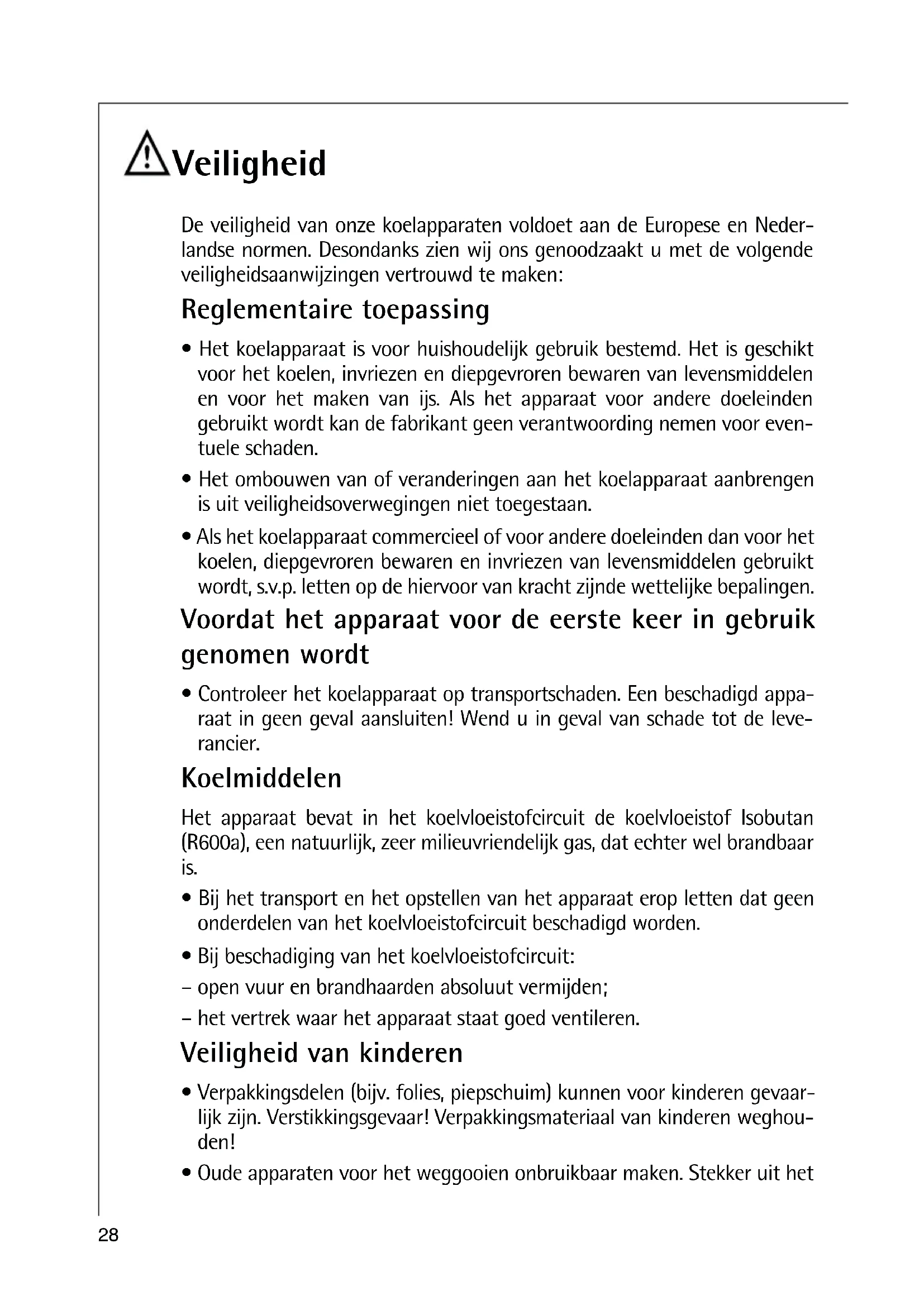 - Doel, normen, richtlijnen Veiligheid De veiligheid van onze koelapparaten voldoet aan de Europese en Neder- landse normen. Desondanks zien wij ons genoodzaakt u met de volgende veiligheidsaanwijzingen vertrouwd te maken: Reglementaire toepassing p. 4728