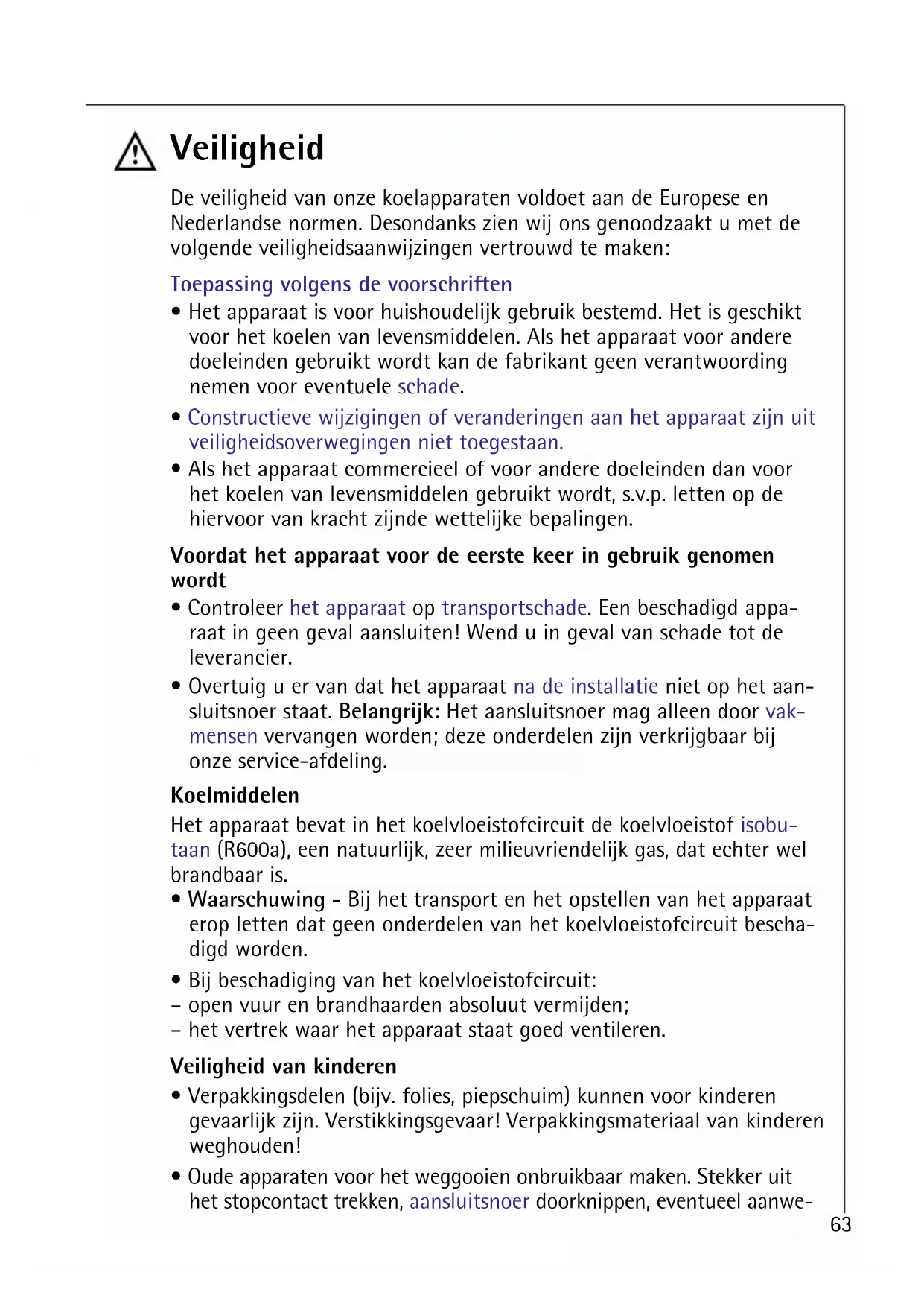 - Overtuig u er van dat het apparaat na de installatie niet op het aan- sluitsnoer staat. Belangrijk: Het aansluitsnoer mag alleen door vak- mensen vervangen worden; deze onderdelen zijn verkrijgbaar bij onze service-afdeling. Koelmiddelen Het apparaat bevat in het koelvloeistofcircuit de koelvloeistof isobu- taan (R600a), een natuurlijk, zeer milieuvriendelijk gas, dat echter wel brandbaar is.