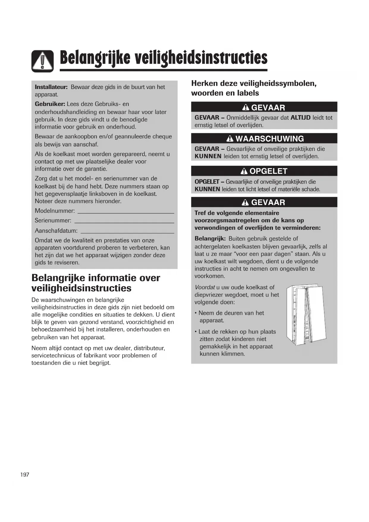 Belangrijk: Buiten gebruik gestelde of achtergelaten koelkasten blijven gevaarlijk, zichs al LaTeX u ze maar "voor een pau段时间" staan. Als u uw koelkast wilt wegdoen, dient u de volgende instructies in acht te nemen om ongevalten te voorkomen.