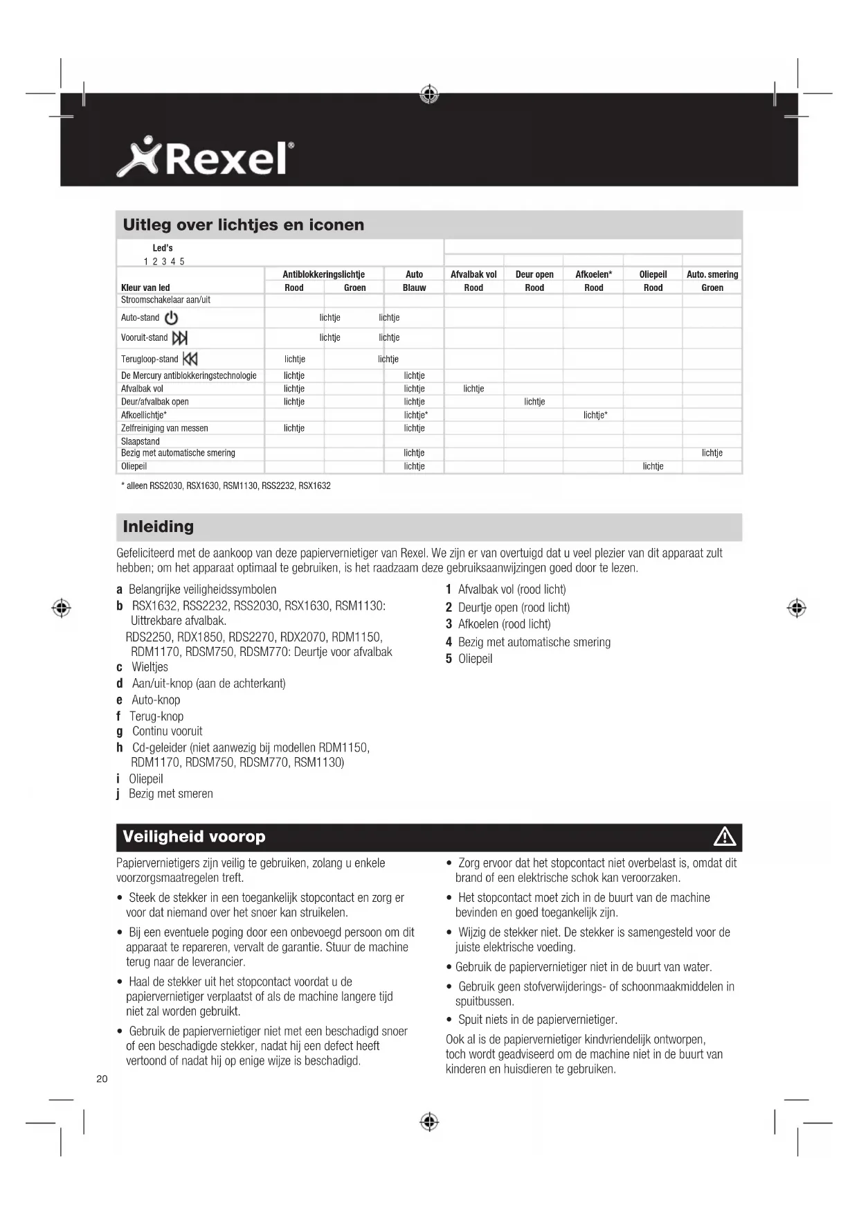 Inleiding Gefeliciteerd met de aankoop van deze papiervernietiger van Rexel. We zijn er van overtuigd dat u veel plezier van dit apparaat zult hebben; om het apparaat optimaal te gebruiken, is het raadzaam deze gebruiksaanwijzingen goed door te lezen. a Belangrijke veiligheidssymbolen b RSX1632, RSS2232, RSS2030, RSX1630, RSM1130: Uittrekbare afvalbak. RDS2250, RDX1850, RDS2270, RDX2070, RDM1150, RDM1170, RDSM750, RDSM770: Deurtje voor afvalbak c Wieltjes d Aan/uit-knop (aan de achterkant) e Auto-knop f Terug-knop g Continu vooruit h Cd-geleider (niet aanwezig bij modellen RDM1150, RDM1170, RDSM750, RDSM770, RSM1130) i Oliepeil j Bezig met smeren 1 Afvalbak vol (rood licht) 2 Deurtje open (rood licht) 3 Afkoelen (rood licht) 4 Bezig met automatische smering 5 Oliepeil Veiligheid voorop Papiervernietigers zijn veilig te gebruiken, zolang u enkele voorzorgsmaatregelen treft.
