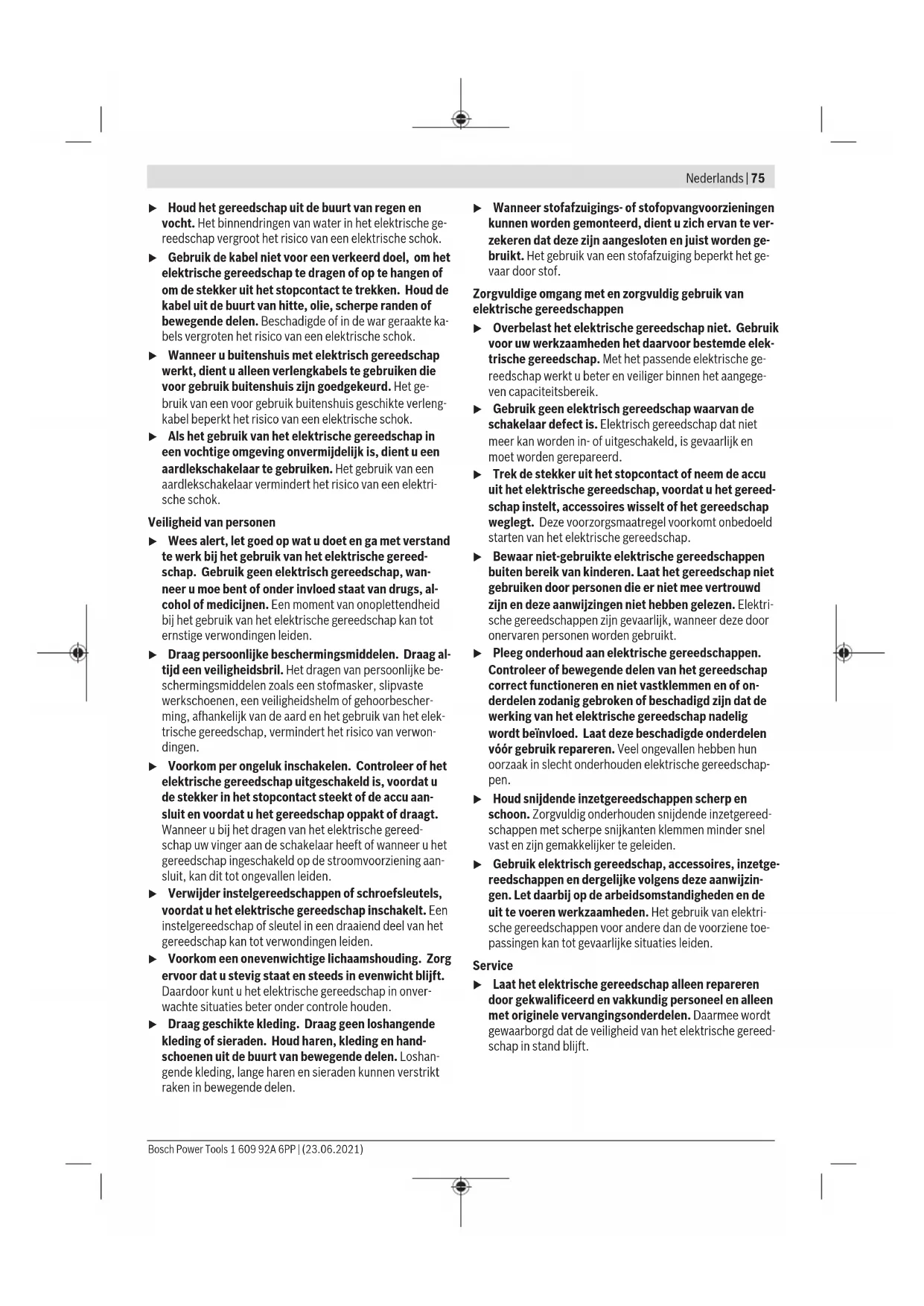 1,5 Het in deze gebruiksaanwijzing vermelde trillingsniveau is gemeten met een volgens ENgenormeerde meetmethode en kan worden gebruikt om elektrische gereedschappen met el- kaar te vergelijken. Het is ook geschikt voor een voorlopige inschatting van de trillingsbelasting. Het aangegeven trillingsniveau representeert de voornaams- te toepassingen van het elektrische gereedschap. Als echter het elektrische gereedschap wordt gebruikt voor andere toe- passingen, met afwijkende inzetgereedschappen of onvol- doende onderhoud, kan het trillingsniveau afwijken. Dit kan 1 609 92A 6PP | (23.06.2021) Bosch Power ToolsNederlands | 81 de trillingsbelasting gedurende de gehele arbeidsperiode duidelijk verhogen. Voor een nauwkeurige schatting van de trillingsbelasting moet ook rekening worden gehouden met de tijd waarin het gereedschap uitgeschakeld is, of waarin het gereedschap wel loopt, maar niet werkelijk wordt gebruikt. Dit kan de tril- lingsbelasting gedurende de gehele arbeidsperiode duidelijk verminderen. Leg aanvullende veiligheidsmaatregelen ter bescherming van de gebruiker tegen het effect van trillingen vast, zoals: onderhoud van elektrische gereedschappen en inzetgereed- schappen, warm houden van de handen, organisatie van het arbeidsproces. Montage Veiligheidsvoorziening monteren u Trek vóór werkzaamheden aan het elektrische gereed- schap altijd de stekker uit het stopcontact. Aanwijzing: Na breuk van de slijpschijf tijdens het gebruik of bij beschadiging van de opnamevoorzieningen bij de be- schermkap/het elektrische gereedschap moet het elektri- sche gereedschap zo spoedig mogelijk naar de klantenservi- ce worden opgestuurd. Zie voor adressen het gedeelte „Klantenservice en gebruiksadvies“. Beschermkap voor slijpen Leg de beschermkap (8) op de houder op het elektrische gereedschap tot de codeer- nokken van de beschermkap overeenstemmen met de houder. Druk daarbij op de ontgrendelingshendel (1) en houd deze ingedrukt. Duw de beschermkap (8) op de ashals tot de kraag van de beschermkap op de flens van het elektrische gereedschap zit en draai de beschermkap tot deze duidelijk hoorbaar vastklikt. Pas de positie van de beschermkap (8) aan de eisen van de bewerking aan. Druk hiervoor de ontgrendelingshendel (1) naar boven en draai de beschermkap (8) in de gewenste po- sitie. u Stel de beschermkap(8) steeds zodanig in dat beide nokken van de ontgrendelingshendel (1) in de betref- fende uitsparingen van de beschermkap (8) grijpen. u Stel de beschermkap (8) zodanig in dat er geen von- ken in de richting van de gebruiker vliegen. u De beschermkap (8) mag alleen bij bediening van de ontgrendelingshendel (1) verdraaid kunnen worden! Anders mag u het elektrische gereedschap in geen ge- val verder gebruiken, maar moet u het opsturen naar de klantenservice. Aanwijzing: De codeernokken op de beschermkap (8) zor- gen ervoor dat uitsluitend een bij het elektrische gereed- schap passende beschermkap gemonteerd kan worden. Afzuigkap voor schuren Voor het stofarm schuren van verf, lak en kunststoffen in combinatie met hardmetalen komschijven (11) kunt u de af- zuigkap (7) gebruiken. De afzuigkap (7) is niet geschikt voor het bewerken van metaal. Op de afzuigkap (7) kan een geschikte Bosch stofzuiger wor- den aangesloten. De afzuigkap (7) wordt net als de beschermkap (8) gemon- teerd. De borstelkrans kan worden vervangen. Beschermkap voor doorslijpen u Gebruik bij het doorslijpen met gebonden slijpmidde- len altijd de beschermkap voor doorslijpen (9). u Zorg bij het doorslijpen van steen voor voldoende stofafzuiging. De beschermkap voor doorslijpen (9) wordt net als de be- schermkap voor slijpen (8) gemonteerd. Stofafzuigkap voor doorslijpen met geleidebeugels De stofafzuigkap voor doorslijpen met geleidebeugels(19) wordt net als de beschermkap voor slijpen gemonteerd. Handbescherming u Monteer voor werken met het rubber schuurplateau (22) of met de komstaalborstel/vlakstaalborstel/la- mellenschuurschijf altijd de handbescherming (21). Bevestig de handbescherming (21) met de extra handgreep (6). Extra handgreep u Gebruik uw elektrische gereedschap alleen met de ex- tra handgreep (6). Schroef de extra handgreep (6) afhankelijk van de werkwijze rechts of links van de machinekop vast. Trillingsdempende extra handgreep Dankzij de trillingsdempen- de extra handgreep kunt u met weinig trillingen en daardoor aangenamer en veiliger werken. u Verander de extra handgreep op geen enkele wijze. Gebruik een beschadigde extra handgreep niet meer. Slijpgereedschap monteren u Trek vóór werkzaamheden aan het elektrische gereed- schap altijd de stekker uit het stopcontact. u Raak de (door)slijpschijven niet aan, voordat ze afge- koeld zijn. De schijven worden bij het werken erg heet. Reinig de slijpas (18) en alle te monteren delen. Druk voor het vastspannen en losmaken van de slijpgereed- schappen op de asblokkeerknop (2) om de slijpas vast te zetten. Bosch Power Tools 1 609 92A 6PP | (23.06.2021)82 | Nederlands u Bedien de asblokkeerknop alleen, als de slijpas stil- staat. Anders kan het elektrische gereedschap bescha- digd raken. (Door)slijpschijf Let op de afmetingen van de slijpaccessoires. De gatdiame- ter moet bij de opnameflens passen. Gebruik geen adapters of reduceerstukken. Let er bij het gebruik van diamantdoorslijpschijven op dat de draairichtingpijl op de diamantdoorslijpschijf en de draai- richting van het elektrische gereedschap (zie draairichting- pijl op de machinekop) overeenstemmen. De volgorde van de montage is te zien op de pagina met af- beeldingen. Voor het bevestigen van de (door)slijpschijf schroeft u de spanmoer(15) erop en spant u deze met de pensleutel (zie „ Snelspanmoer “, Pagina82). u Controleer na de montage van het slijpgereedschap en vóór het inschakelen of het slijpgereedschap cor- rect is gemonteerd en vrij kan draaien. Controleer of het slijpgereedschap de beschermkap of andere delen niet raakt. In de opnameflens (10) is om de centreerkraag een kunststof deel (O-ring) gepla