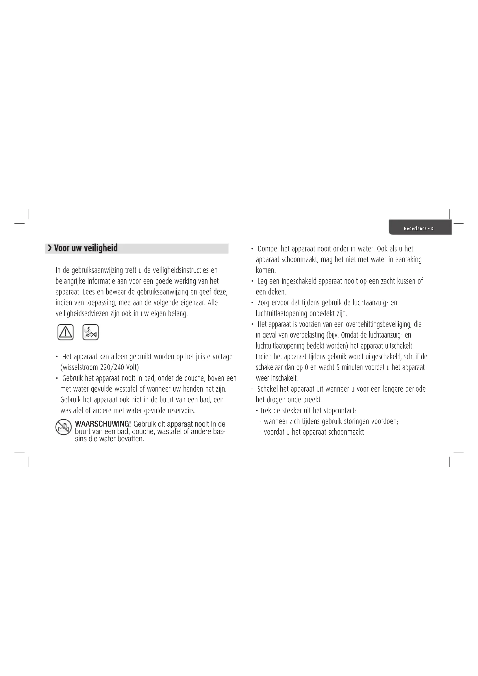 - Gebruik het apparaat nooit in bad, onder de douche, boven een met water gemulde wastafel of wanneer uw handen nat+zijn. Gebruik het apparaat ook Niet in de buurt van een bad, een wastafel of andere met water gemulde reservoirs.