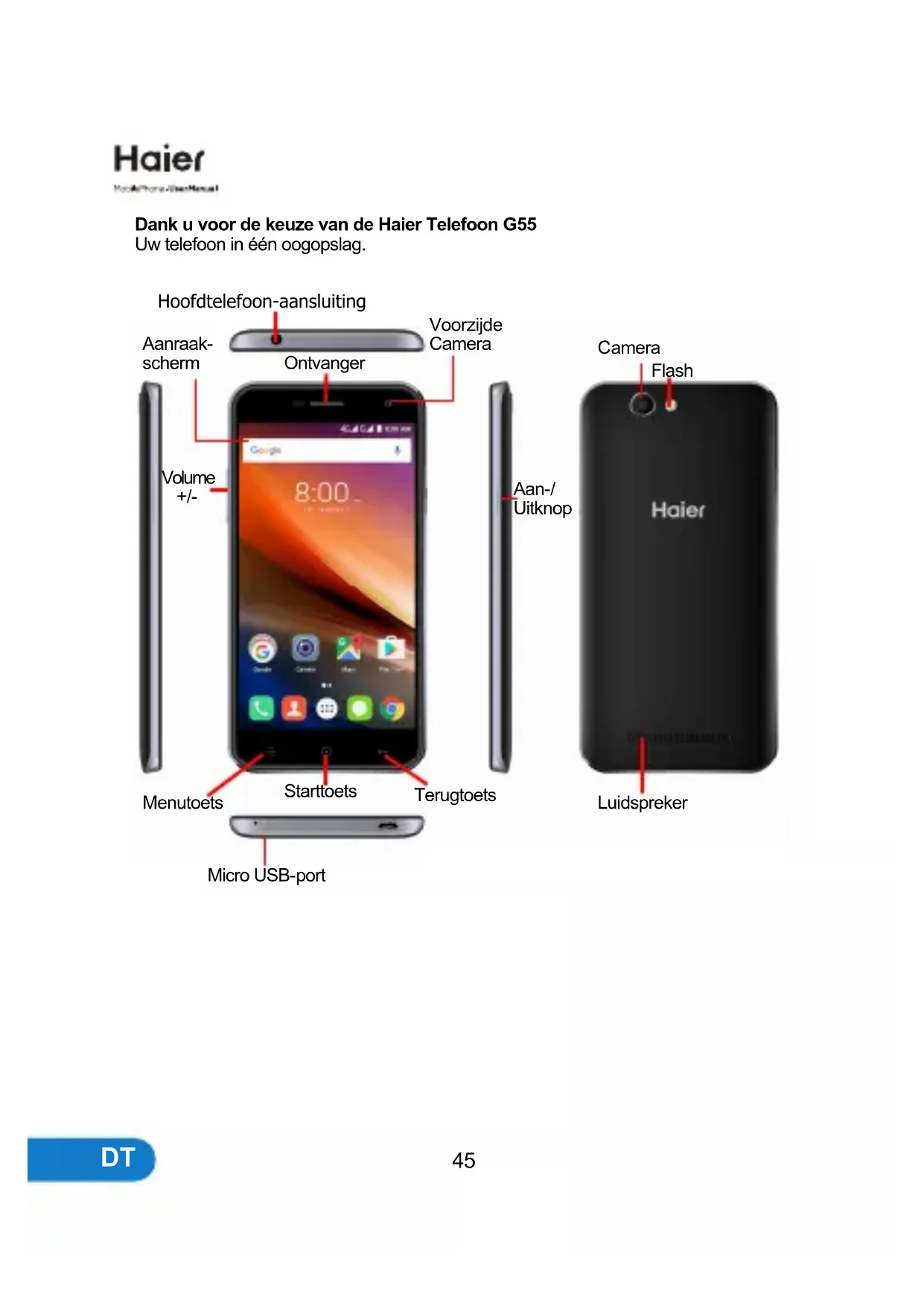 Dank u voor de keuze van de Haier Telefoon G55 Uw telefoon in één oogopslag. Starttoets Micro USB-port Menutoets Terugtoets Volume +/- Aanraak- scherm Aan-/ Uitknop Voorzijde Camera Ontvanger Luidspreker Camera Flash Hoofdtelefoon-aansluiting DT46