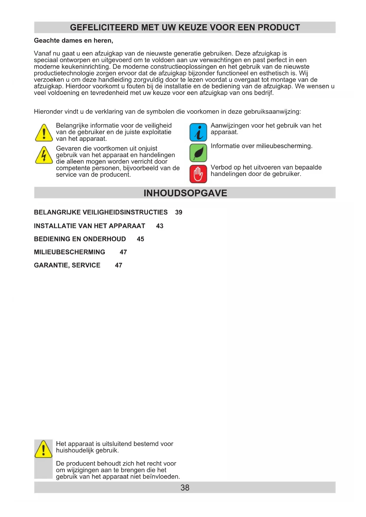 INHOUDSOPGAVE Geachte dames en heren, Vanaf nu gaat u een afzuigkap van de nieuwste generatie gebruiken. Deze afzuigkap is speciaal ontworpen en uitgevoerd om te voldoen aan uw verwachtingen en past perfect in een moderne keukeninrichting. De moderne constructieoplossingen en het gebruik van de nieuwste productietechnologie zorgen ervoor dat de afzuigkap bijzonder functioneel en esthetisch is. Wij verzoeken u om deze handleiding zorgvuldig door te lezen voordat u overgaat tot montage van de afzuigkap. Hierdoor voorkomt u fouten bij de installatie en de bediening van de afzuigkap. We wensen u veel voldoening en tevredenheid met uw keuze voor een afzuigkap van ons bedrijf. GEFELICITEERD MET UW KEUZE VOOR EEN PRODUCT Hieronder vindt u de verklaring van de symbolen die voorkomen in deze gebruiksaanwijzing: Verbod op het uitvoeren van bepaalde handelingen door de gebruiker. Gevaren die voortkomen uit onjuist gebruik van het apparaat en handelingen die alleen mogen worden verricht door competente personen, bijvoorbeeld van de service van de producent. Belangrijke informatie voor de veiligheid van de gebruiker en de juiste exploitatie van het apparaat. Aanwijzingen voor het gebruik van het apparaat.