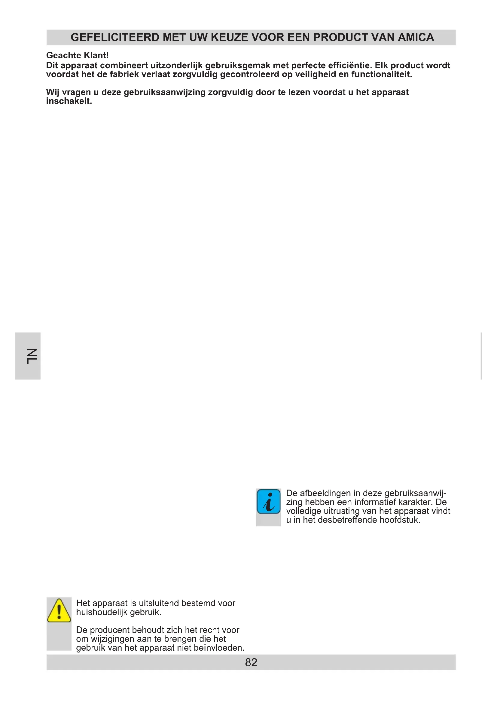Garantie Le service de garantie est fonction de la carte de garantie. Le fabricant n’est pas responsable des dommages causés par une mauvaise manipulation du produit. FR82 Ditapparaatcombineertuitzonderlijkgebruiksgemakmetperfecteefciëntie.Elkproductwordt voordathetdefabriekverlaatzorgvuldiggecontroleerdopveiligheidenfunctionaliteit. Wijvragenudezegebruiksaanwijzingzorgvuldigdoortelezenvoordatuhetapparaat inschakelt. GeachteKlant! GEFELICITEERDMETUWKEUZEVOOREENPRODUCTVANAMICA Het apparaat is uitsluitend bestemd voor huishoudelijk gebruik. De producent behoudt zich het recht voor om wijzigingen aan te brengen die het gebruik van het apparaat niet beïnvloeden.