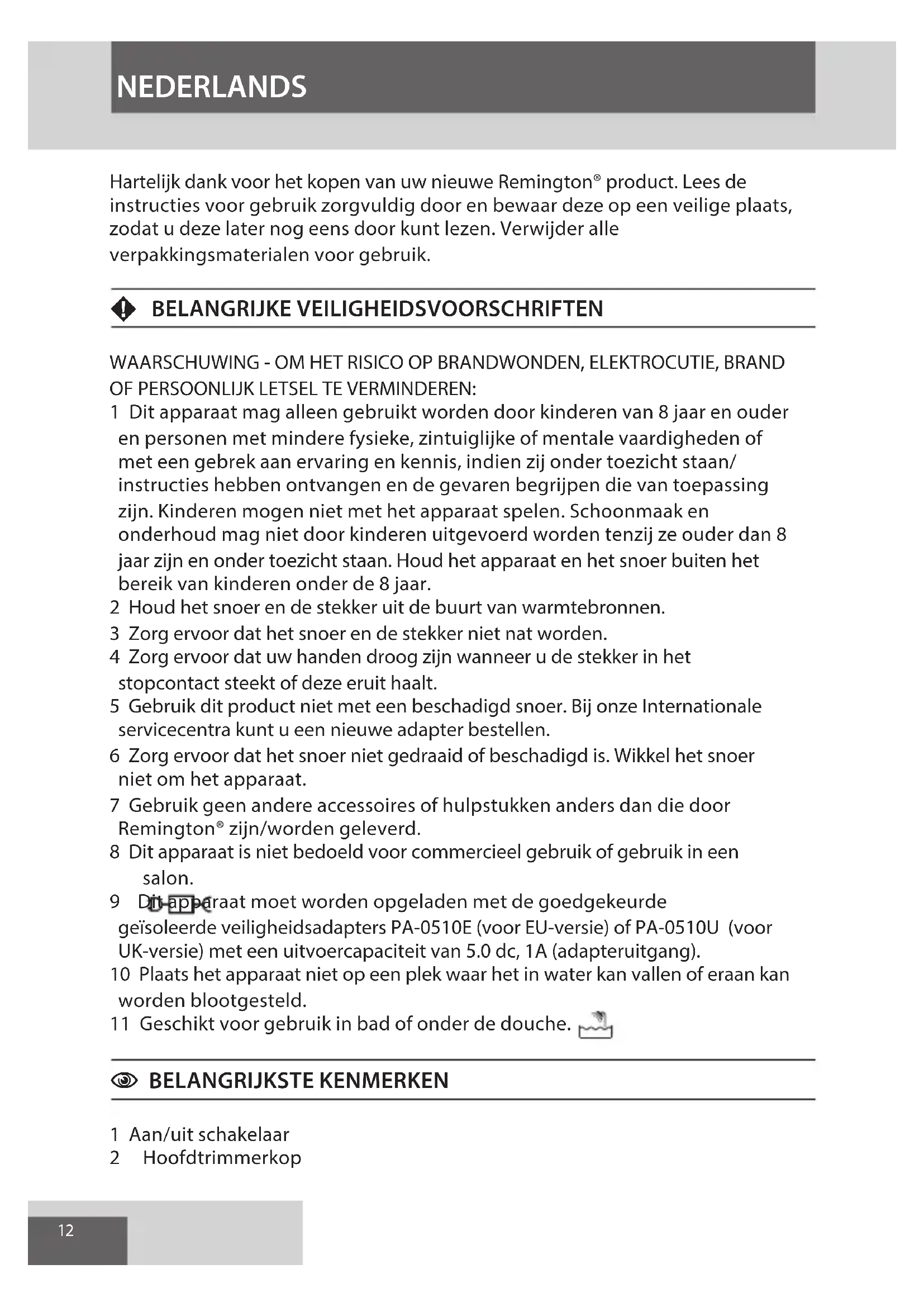 WAARSCHUWING - OM HET RISICO OP BRANDWONDEN, ELEKTROCUTIE, BRAND OF PERSOONLIJK LETSEL TE VERMINDEREN: 1 Dit apparaat mag alleen gebruikt worden door kinderen van 8 jaar en ouder en personen met mindere fysieke, zintuiglijke of mentale vaardigheden of met een gebrek aan ervaring en kennis, indien zij onder toezicht staan/ instructies hebben ontvangen en de gevaren begrijpen die van toepassing zijn. Kinderen mogen niet met het apparaat spelen. Schoonmaak en onderhoud mag niet door kinderen uitgevoerd worden tenzij ze ouder dan 8 jaar zijn en onder toezicht staan. Houd het apparaat en het snoer buiten het bereik van kinderen onder de 8 jaar. 2 Houd het snoer en de stekker uit de buurt van warmtebronnen. 3 Zorg ervoor dat het snoer en de stekker niet nat worden. 4 Zorg ervoor dat uw handen droog zijn wanneer u de stekker in het stopcontact steekt of deze eruit haalt. 5 Gebruik dit product niet met een beschadigd snoer. Bij onze Internationale servicecentra kunt u een nieuwe adapter bestellen. 6 Zorg ervoor dat het snoer niet gedraaid of beschadigd is. Wikkel het snoer niet om het apparaat. 7 Gebruik geen andere accessoires of hulpstukken anders dan die door Remington® zijn/worden geleverd. 8 Dit apparaat is niet bedoeld voor commercieel gebruik of gebruik in een salon. 9 Dit apparaat moet worden opgeladen met de goedgekeurde geïsoleerde veiligheidsadapters PA-0510E (voor EU-versie) of PA-0510U (voor UK-versie) met een uitvoercapaciteit van 5.0 dc, 1A (adapteruitgang). 10 Plaats het apparaat niet op een plek waar het in water kan vallen of eraan kan worden blootgesteld. 11 Geschikt voor gebruik in bad of onder de douche.