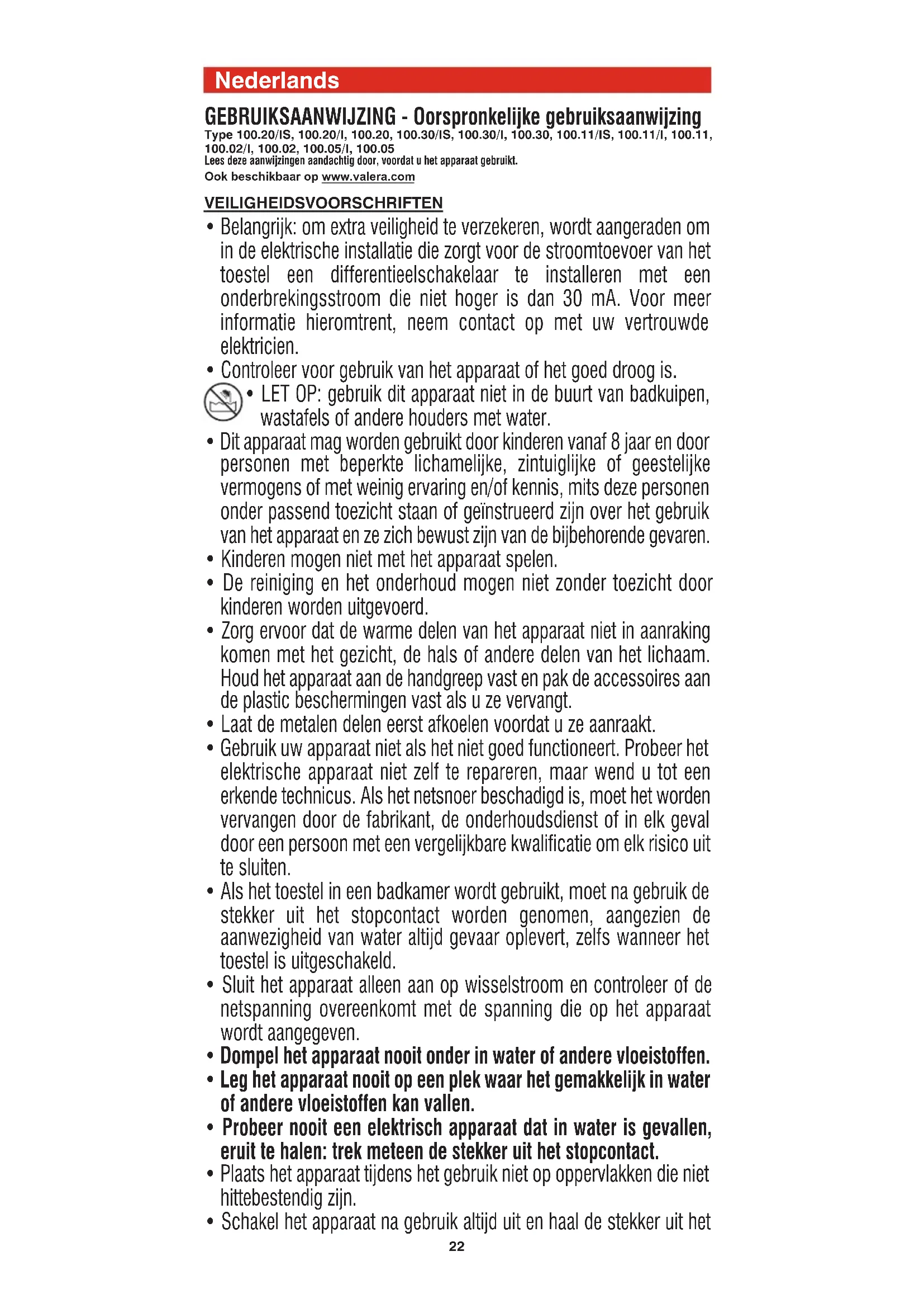 gerepareerd werd door een niet erkende persoon. In geval van defect, gelieve het toestel behoorlijk verpakt, samen met het garantiebewijs (gedateerd en voorzien van de stempel van de verkoper) terug te sturen naar één van de officiële Service Centra, of te bezorgen aan de winkel waar het toestel werd aangekocht. Zij zullen het nodige doen om uw toestel onder garantie te laten herstellen. 00060714 int_mar2017:Layout 1 07/03/2017 9.20 Pagina 2425 Portoguês INSTRUÇÕES DE FUNCIONAMENTO - Instruções originais Tipo 100.20/IS, 100.20/I, 100.20, 100.30/IS, 100.30/I, 100.30, 100.11/IS, 100.11/I, 100.11, 100.02/I, 100.02, 100.05/I, 100.05 Leia atentamente estas instruções antes de utilizar o aparelho. Também disponível em www.valera.com