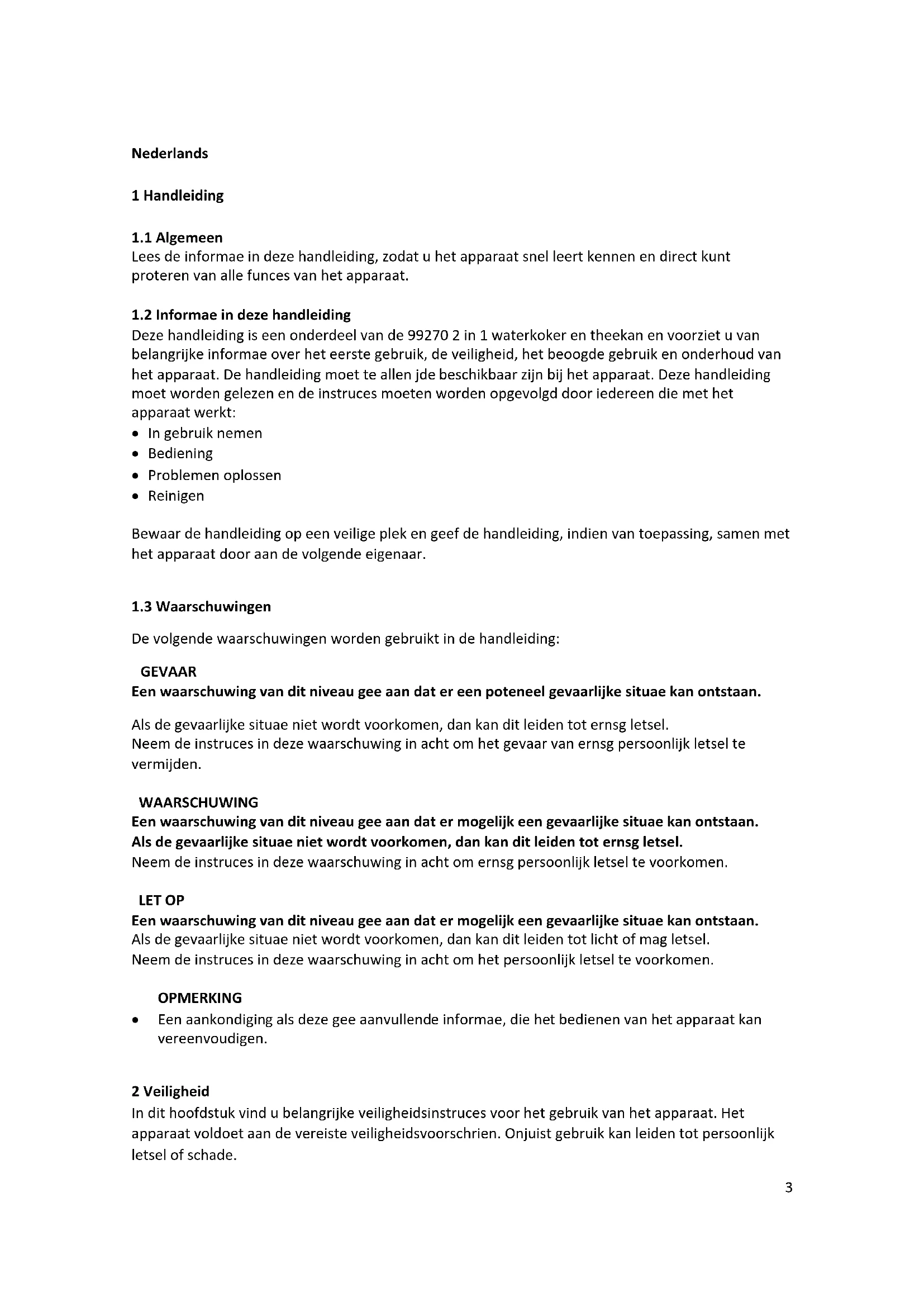 Deze handleiding is een onderdeel van de 99270 2 in 1 waterkoker en theekan en voorziet u van belangrijke informatie over het eerste gebruik, de veiligheid, het beoogde gebruik en onderhoud van het apparaat. De handleiding moet te allen tijde beschikbaar zijn bij het apparaat. Deze handleiding moet worden gelezen en de instructies moeten worden opgevolgd door iedereen die met het apparaat werkt: In gebruik nemen Bediening Problemen oplossen Reinigen Bewaar de handleiding op een veilige plek en geef de handleiding, indien van toepassing, samen met het apparaat door aan de volgende eigenaar.