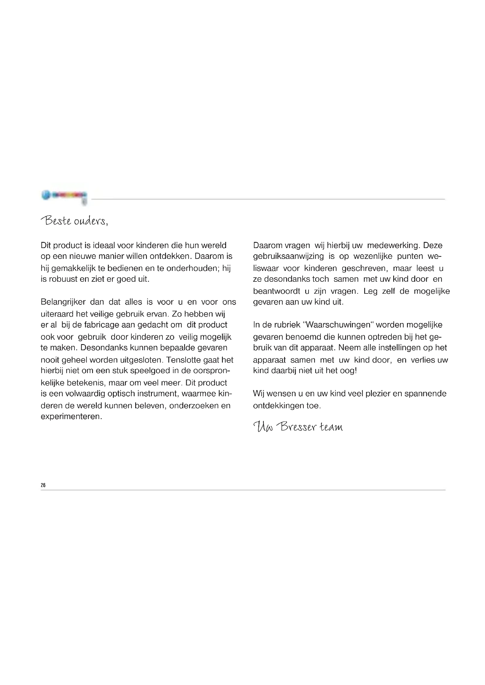 utilisation. Certains conteneurs contiennent des liquides qui peuvent facilement se dessécher.FR26 Beste ouders, Dit product is ideaal voor kinderen die hun wereld op een nieuwe manier willen ontdekken. Daarom is hij gemakkelijk te bedienen en te onderhouden; hij is robuust en ziet er goed uit. Belangrijker dan dat alles is voor u en voor ons uiteraard het veilige gebruik ervan. Zo hebben wij er al bij de fabricage aan gedacht om dit product ook voor gebruik door kinderen zo veilig mogelijk te maken. Desondanks kunnen bepaalde gevaren nooit geheel worden uitgesloten. Tenslotte gaat het hierbij niet om een stuk speelgoed in de oorspron- kelijke betekenis, maar om veel meer. Dit product is een volwaardig optisch instrument, waarmee kin- deren de wereld kunnen beleven, onderzoeken en experimenteren. Daarom vragen wij hierbij uw medewerking. Deze gebruiksaanwijzing is op wezenlijke punten we- liswaar voor kinderen geschreven, maar leest u ze desondanks toch samen met uw kind door en beantwoordt u zijn vragen. Leg zelf de mogelijke gevaren aan uw kind uit. In de rubriek “Waarschuwingen“ worden mogelijke gevaren benoemd die kunnen optreden bij het ge- bruik van dit apparaat. Neem alle instellingen op het apparaat samen met uw kind door, en verlies uw kind daarbij niet uit het oog! Wij wensen u en uw kind veel plezier en spannende ontdekkingen toe. Uw Bresser team27