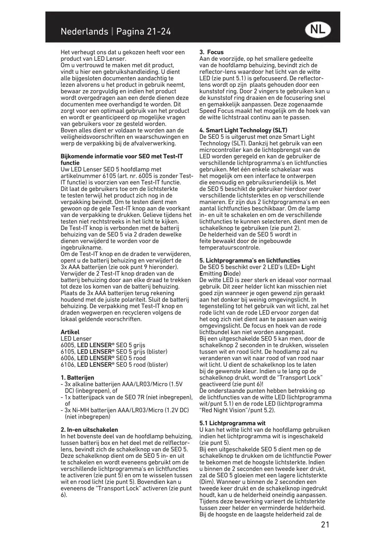 Nederlands | Pagina 21-24 Het verheugt ons dat u gekozen heeft voor een product van LED Lenser. Om u vertrouwd te maken met dit product, vindt u hier een gebruikshandleiding. U dient alle bijgesloten documenten aandachtig te lezen alvorens u het product in gebruik neemt, bewaar ze zorgvuldig en indien het product wordt overgedragen aan een derde dienen deze documenten mee overhandigd te worden. Dit zorgt voor een optimaal gebruik van het product en wordt er geanticipeerd op mogelijke vragen van gebruikers voor ze gesteld worden. Boven alles dient er voldaan te worden aan de veiligheidsvoorschriften en waarschuwingen en werp de verpakking bij de afvalverwerking. Bijkomende informatie voor SEO met Test-IT functie Uw LED Lenser SEO 5 hoofdlamp met artikelnummer 6105 (art. nr. 6005 is zonder Test- IT functie) is voorzien van een Test-IT functie. Dit laat de gebruikers toe om de lichtsterkte te testen terwijl het product zich nog in de verpakking bevindt. Om te testen dient men gewoon op de gele Test-IT knop aan de voorkant van de verpakking te drukken. Gelieve tijdens het testen niet rechtstreeks in het licht te kijken. De Test-IT knop is verbonden met de batterij behuizing van de SEO 5 via 2 draden dewelke dienen verwijderd te worden voor de ingebruikname. Om de Test-IT knop en de draden te verwijderen, opent u de batterij behuizing en verwijdert de 3x AAA batterijen (zie ook punt 9 hieronder). Verwijder de 2 Test-IT knop draden van de batterij behuizing door aan elke draad te trekken tot deze los komen van de batterij behuizing. Plaats de 3x AAA batterijen terug rekening houdend met de juiste polariteit. Sluit de batterij behuizing. De verpakking met Test-IT knop en draden wegwerpen en recycleren volgens de lokaal geldende voorschriften. Artikel LED Lenser 6005, LED LENSER® SEO 5 grijs 6105, LED LENSER® SEO 5 grijs (blister) 6006, LED LENSER® SEO 5 rood 6106, LED LENSER® SEO 5 rood (blister)