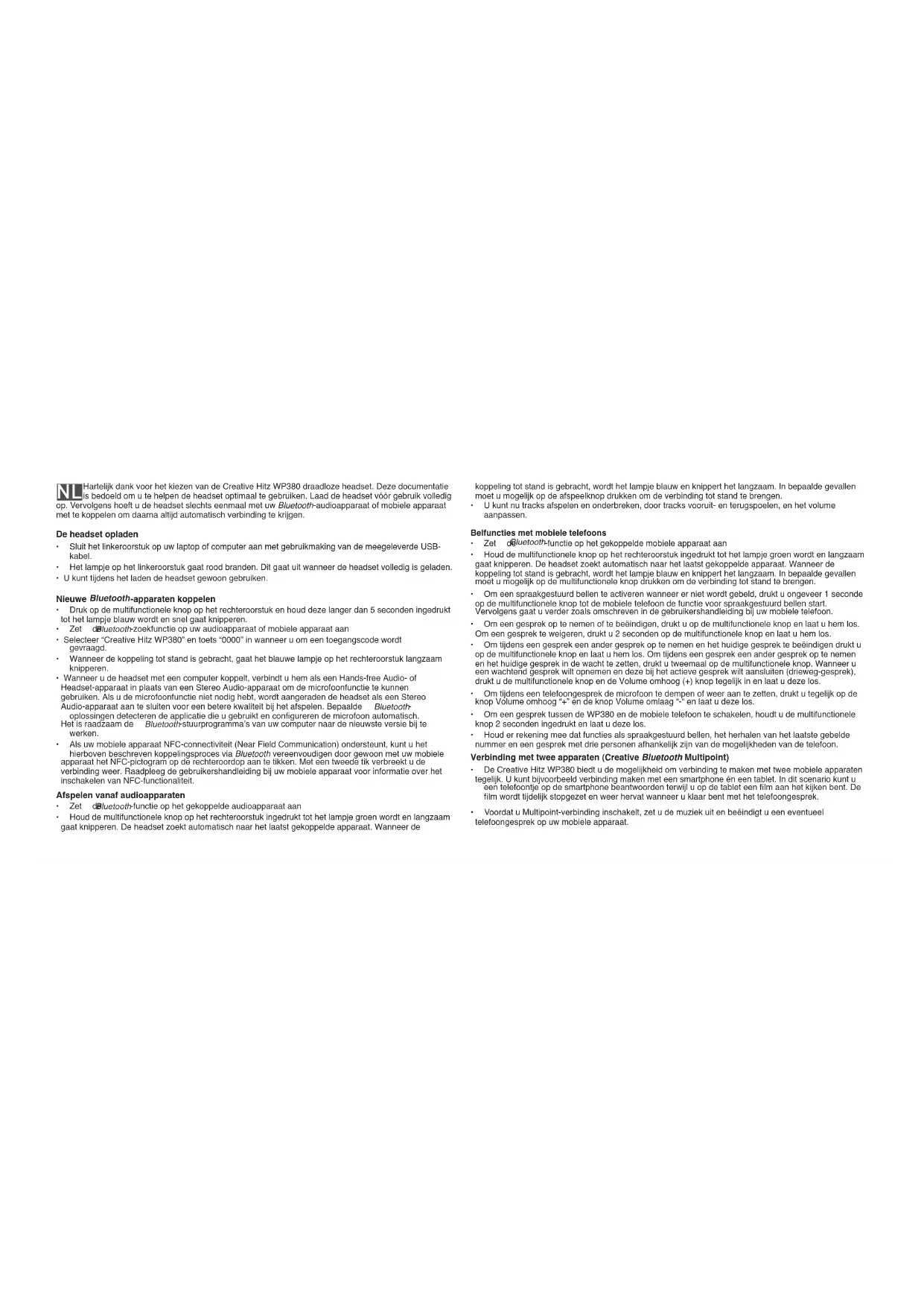 - De Creative Hitz WP380 biedt u de mogelijkheid om verbinding te maken met twee mobiele apparaten tegelijk. U kunt bijvoorbeeld verbinding maken met een smartphone én een tablet. In dit scenario kunt u een telefoontje op de smartphone beantwoorden terwijl u op de tablet een fi lm aan het kijken bent. De fi lm wordt tijdelijk stopgezet en weer hervat wanneer u klaar bent met het telefoongesprek.