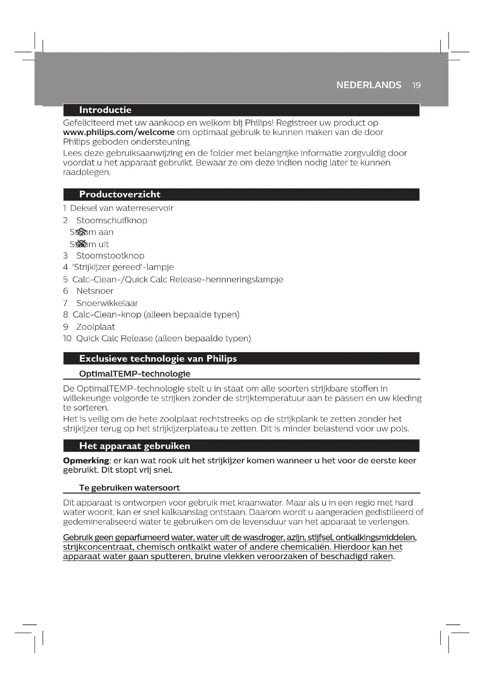 Probleem Mogelijke oorzaak Oplossing Het strijkijzer produceert geen stoom. Er zit niet voldoende water in de tank. Vul het waterreservoir. De stoomschuifknop is ingesteld op . Zet de stoomschuifknop in de stand . Het strijkijzer is niet warm genoeg om stoom te produceren. Wacht tot het 'strijkijzer gereed'-lampje niet meer pulseert, maar continu brandt. De strijkplankhoes wordt nat of er zijn waterdruppels op het kledingstuk gekomen tijdens het strijken. Stoom is gecondenseerd op de strijkplank na een lange strijkbeurt. Vervang de schuimlaag van de strijkplankhoes als deze versleten is. U kunt ook een extra laag vilt onder de strijkplankhoes leggen om condens op de strijkplank te voorkomen. U kunt vilt in een stoenwinkel kopen. U hebt een strijkplankhoes die niet bestand is tegen het hoge stoomniveau van het apparaat. Leg een extra laag vilt onder de strijkplankhoes om condensatie op de strijkplank te voorkomen. U kunt vilt in een stoenwinkel kopen. Er vallen druppeltjes water op de kleding tijdens het strijken. U hebt de stoomstootfunctie te vaak achter elkaar gebruikt. Ga verder met strijken, met het apparaat in horizontale stand, en wacht een tijdje voordat u de stoomstootfunctie opnieuw gebruikt. U hebt het deksel van het waterreservoir niet goed gesloten. Druk op het klepje tot u een 'klik' hoort. U hebt de opvangbank van de Quick Calc Release niet goed terug in het apparaat geplaatst (alleen bepaalde typen). Stop met strijken en laat het strijkijzer ten minste 1 uur afkoelen. Trek de Quick Calc Release-opvangbak uit het apparaat. Plaats het terug in het apparaat en zorg ervoor dat de opvangbak in lijn is met het oppervlak van het apparaat. Duw de hendel omlaag ("klik"). Als de Quick Calc Release-opvangbak is beschadigd, neem dan contact op met een Consumer Care Centre in uw land (zie het 'worldwide guarantee'-vouwblad voor contactgegevens). Het strijkijzer produceert geen stoomstoot. U hebt de stoomstootfunctie te vaak achter elkaar gebruikt. Ga verder met strijken, met het apparaat in horizontale stand, en wacht een tijdje voordat u de stoomstootfunctie opnieuw gebruikt. Het strijkijzer is nog niet warm genoeg om te strijken. Wacht tot het 'strijkijzer gereed'-lampje niet meer pulseert, maar continu brandt. U hebt een chemische stof in het waterreservoir gedaan. Spoel het waterreservoir schoon en doe geen reukstoen of andere chemicaliën in het waterreservoir. Er komen vuil water en verontreinigingen uit de zoolplaat tijdens het strijken. Hard water met onzuiverheden of chemische stoen heeft schilfers gevormd in de zoolplaat. Voer Quick Calc Release (alleen bepaalde typen) of Calc-Clean (alleen bepaalde typen) uit. Zie hoofdstuk 'Schoonmaken en onderhoud'. Er komen waterdruppels uit de zoolplaat nadat de stekker uit het stopcontact is gehaald. Het strijkijzer is in horizontale stand blijven staan terwijl er nog water in het waterreservoir zat. Leeg het waterreservoir na gebruik of berg het strijkijzer in de verticale stand op. De stoomschuifknop is ingesteld op . Zet de stoomschuifknop op . Er knippert een oranje lampje op de handgreep van het strijkijzer. Het Calc-Clean- herinneringslampje is geactiveerd. Dit is om u eraan te herinneren dat u Calc-Clean moet uitvoeren. Voer Quick Calc Release (alleen bepaalde typen) of Calc-Clean (alleen bepaalde typen) uit. Zie hoofdstuk 'Schoonmaken en onderhoud'. Het strijkijzer laat een glans of een afdruk op het kledingstuk na. Het oppervlak dat gestreken moest worden was ongelijk, bijvoorbeeld omdat u over een naad of een vouw in het kledingstuk hebt gestreken. Het strijkijzer is veilig te gebruiken op alle strijkbare kledingstukken. Een glimmende plek of afdruk is niet permanent en verdwijnt als u het kledingstuk wast. Strijk niet over naden of vouwen. U kunt ook een katoenen doek over het te strijken gedeelte leggen om afdrukken te voorkomen.23 DANSK Introduktion Tillykke med dit køb og velkommen til Philips! Hvis du vil have fuldt udbytte af den support, som Philips tilbyder, kan du registrere dit produkt på www.philips.com/welcome. Læs denne brugervejledning og brochuren med vigtige oplysninger omhyggeligt igennem, inden apparatet tages i brug. Gem dem til senere brug. Produktoversigt 1 Låg til vandtank 2 Dampskyder Damp til Damp fra 3 Knap til dampskud 4 Lysindikator for "strygejernet er klar" 5 Lysindikator for påmindelse om Calc-Clean/Hurtig afkalkning 6 Netledning 7 Ledningsoprul 8 Calc-Clean-knap (gælder kun nogle modeller) 9 Strygesål 10 Hurtig afkalkning (gælder kun nogle modeller) Eksklusiv teknologi fra Philips OptimalTEMP-teknologi OptimalTEMP-teknologien gør det muligt at stryge alle strygbare stoer, i vilkårlig rækkefølge, uden at justere strygetemperaturen eller sortere tøjet. Det er sikkert blot at lade den varme strygesål stå direkte på strygebrættet uden at sætte det tilbage i holderen. Herved mindskes belastningen af håndleddet. Sådan bruges apparatet Bemærk: Strygejernet kan afgive lidt røg, når det tages i brug første gang. Dette stopper efter kort tid. Type af vand, der skal bruges Der skal kommes vand fra hanen i apparatet. Hvis du bor i et område med hårdt vand, kan der dog hurtigt komme kalkaejringer. Derfor anbefales det at bruge destilleret eller demineraliseret vand for at forlænge apparatets levetid. Brug ikke parfumeret vand, vand fra en tørretumbler, eddike, stivelse, afkalkningsmiddel, strygemiddel, kemisk afkalket vand eller andre kemikalier, da de kan medføre vandstænk, brune pletter eller skader på apparatet.DANSK