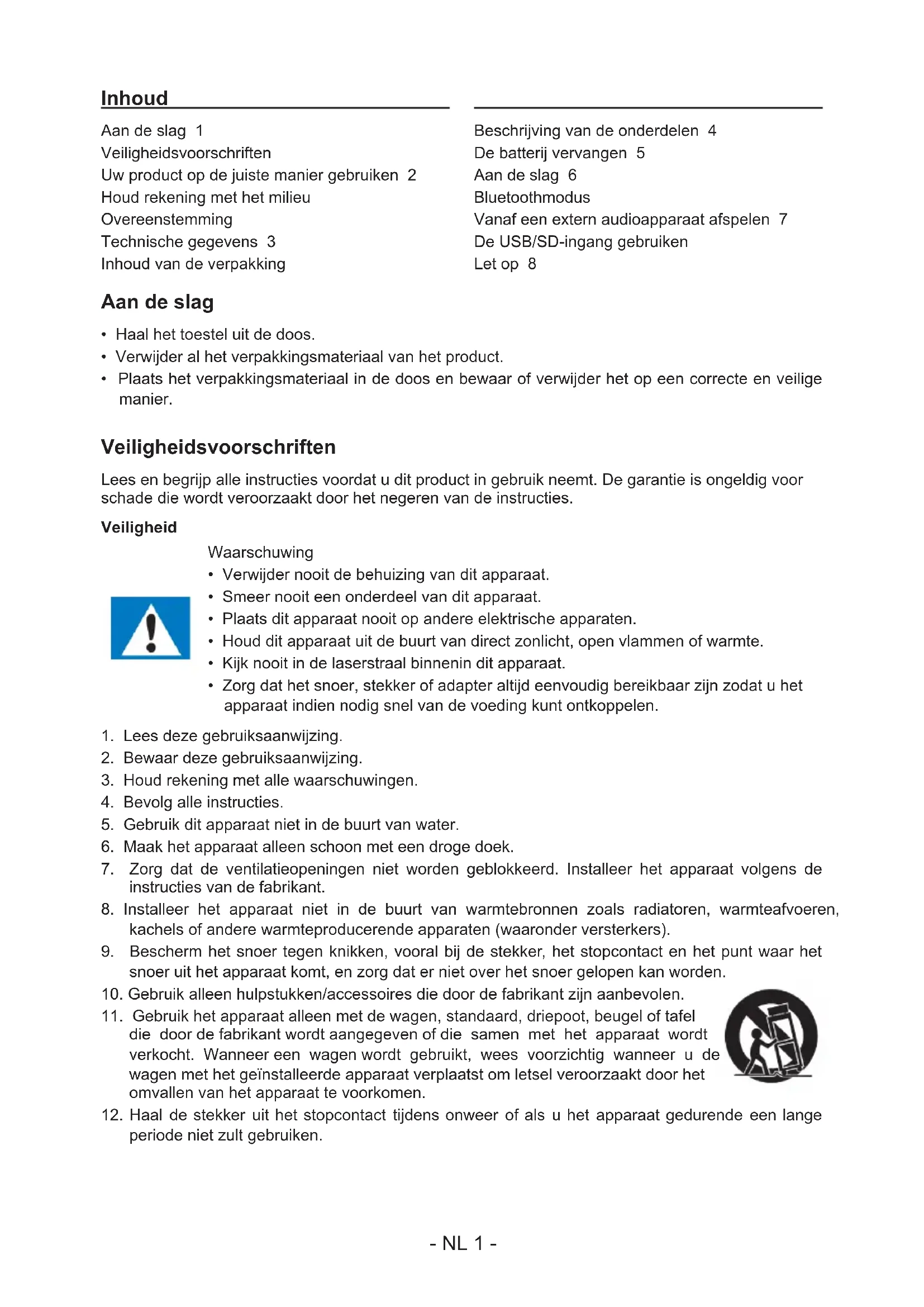 ALVORENS DEZE EENHEID TE BEDIENEN, EN BEWAAR DIT BOEKJE VOOR UW ADMINISTRATIE. NL- NL 1 - Inhoud Aan de slag 1 Veiligheidsvoorschriften Uw product op de juiste manier gebruiken 2 Houd rekening met het milieu Overeenstemming Technische gegevens 3 Inhoud van de verpakking Beschrijving van de onderdelen 4 De batterij vervangen 5 Aan de slag 6 Bluetoothmodus Vanaf een extern audioapparaat afspelen 7 De USB/SD-ingang gebruiken Let op 8 Aan de slag