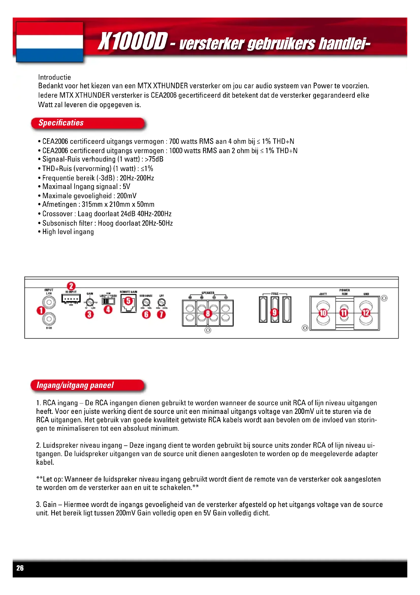Bedankt voor het kiezen van een MTX XTHUNDER versterker om jou car audio systeem van Power te voorzien. Iedere MTX XTHUNDER versterker is CEA2006 gecertificeerd dit betekent dat de versterker gegarandeerd elke Watt zal leveren die opgegeven is.