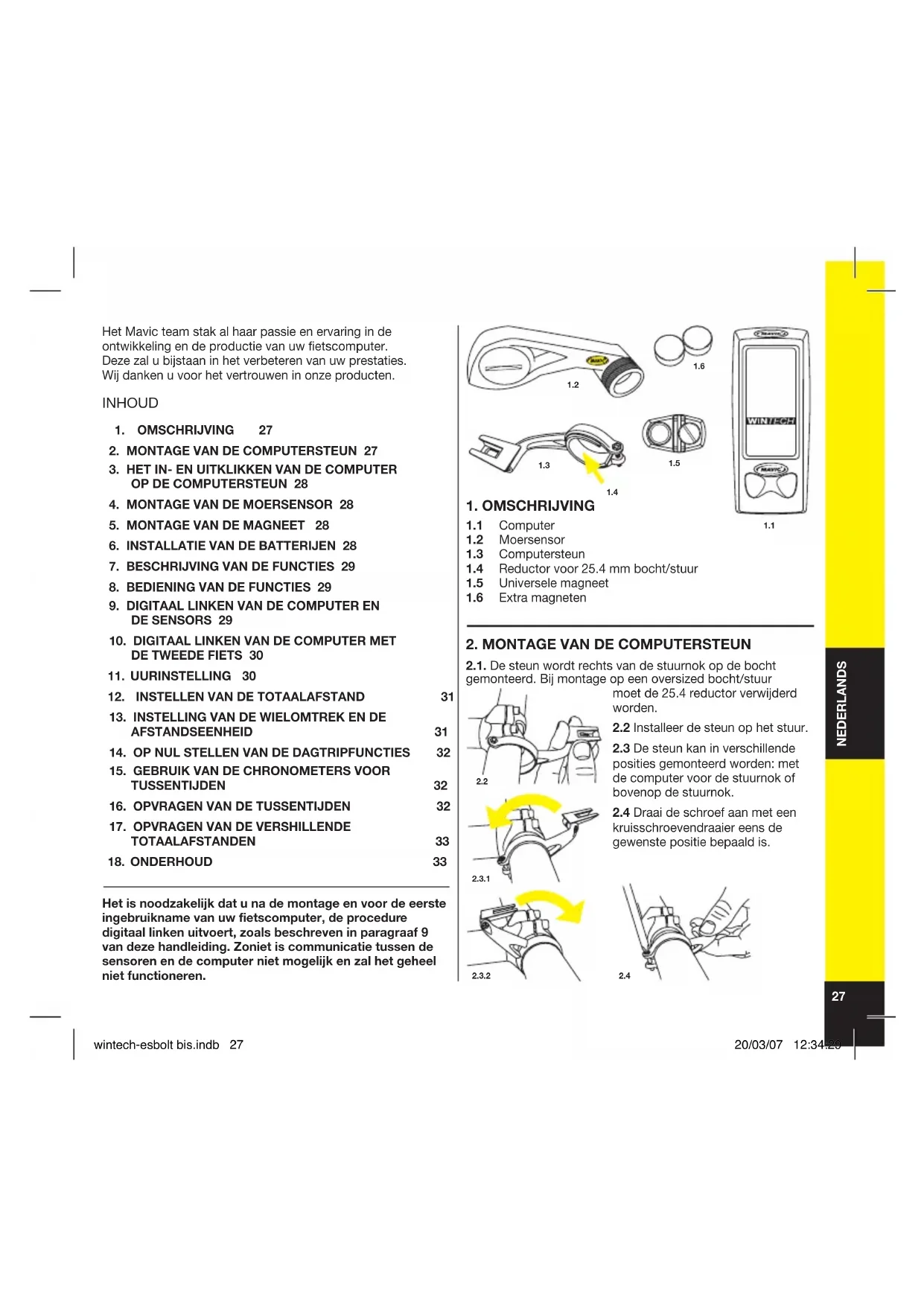kruisschroevendraaier eens de gewenste positie bepaald is. Het Mavic team stak al haar passie en ervaring in de ontwikkeling en de productie van uw fietscomputer. Deze zal u bijstaan in het verbeteren van uw prestaties. Wij danken u voor het vertrouwen in onze producten. INHOUD