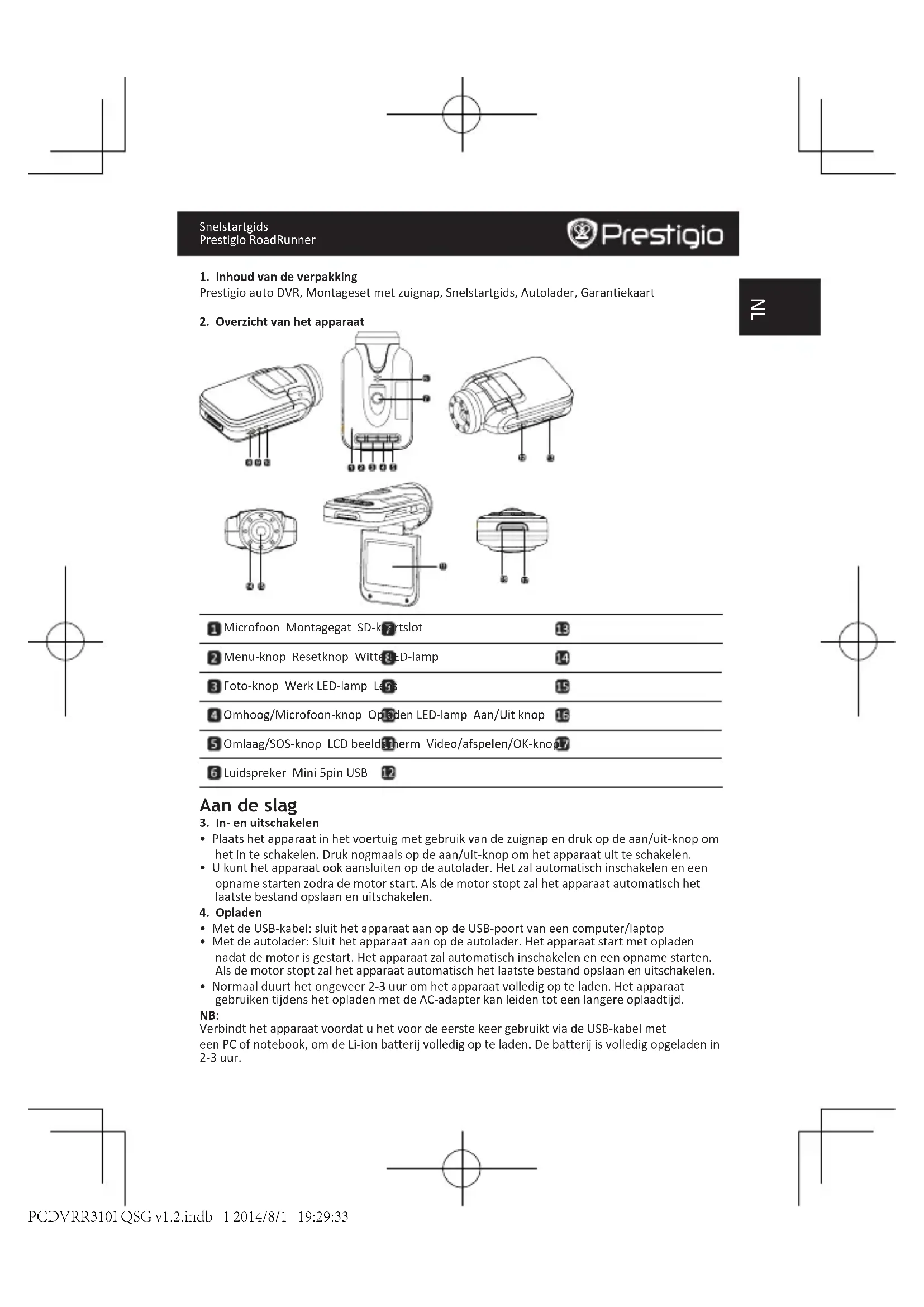 - Normaal duurt het ongeveer 2-3 uur om het apparaat volledig op te laden. Het apparaat gebruiken tijdens het opladen met de AC-adapter kan leiden tot een langere oplaadtijd. NB: Verbindt het apparaat voordat u het voor de eerste keer gebruikt via de USB-kabel met een PC of notebook, om de Li-ion batterij volledig op te laden. De batterij is volledig opgeladen in 2-3 uur. PCDVRR310I QSG v1.2.indb 1 2014/8/1 19:29:33Snelstartgids Prestigio RoadRunner