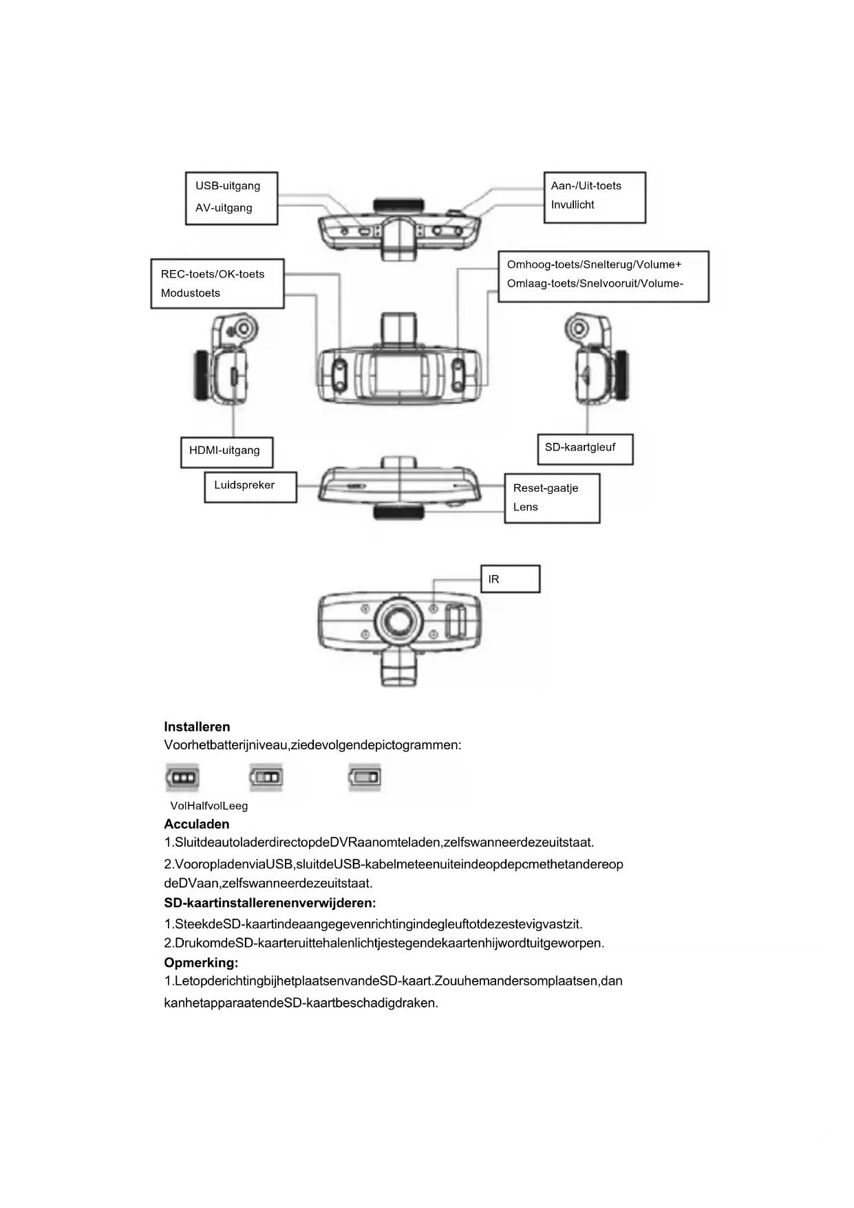Aan-/Uit-toets Invullicht HDMI-uitgang Reset-gaatje Lens SD-kaartgleuf Luidspreker Omhoog-toets/Snel terug / Volume+ Omlaag-toets/Snel vooruit/Volume -2. Wanneer de SD-kaart in het apparaat wordt geplaatst, stelt het apparaat de SD-kaart in als de voorkeursopslageenheid en zullen de gegevens op de originele SD-kaart onleesbaar zijn.