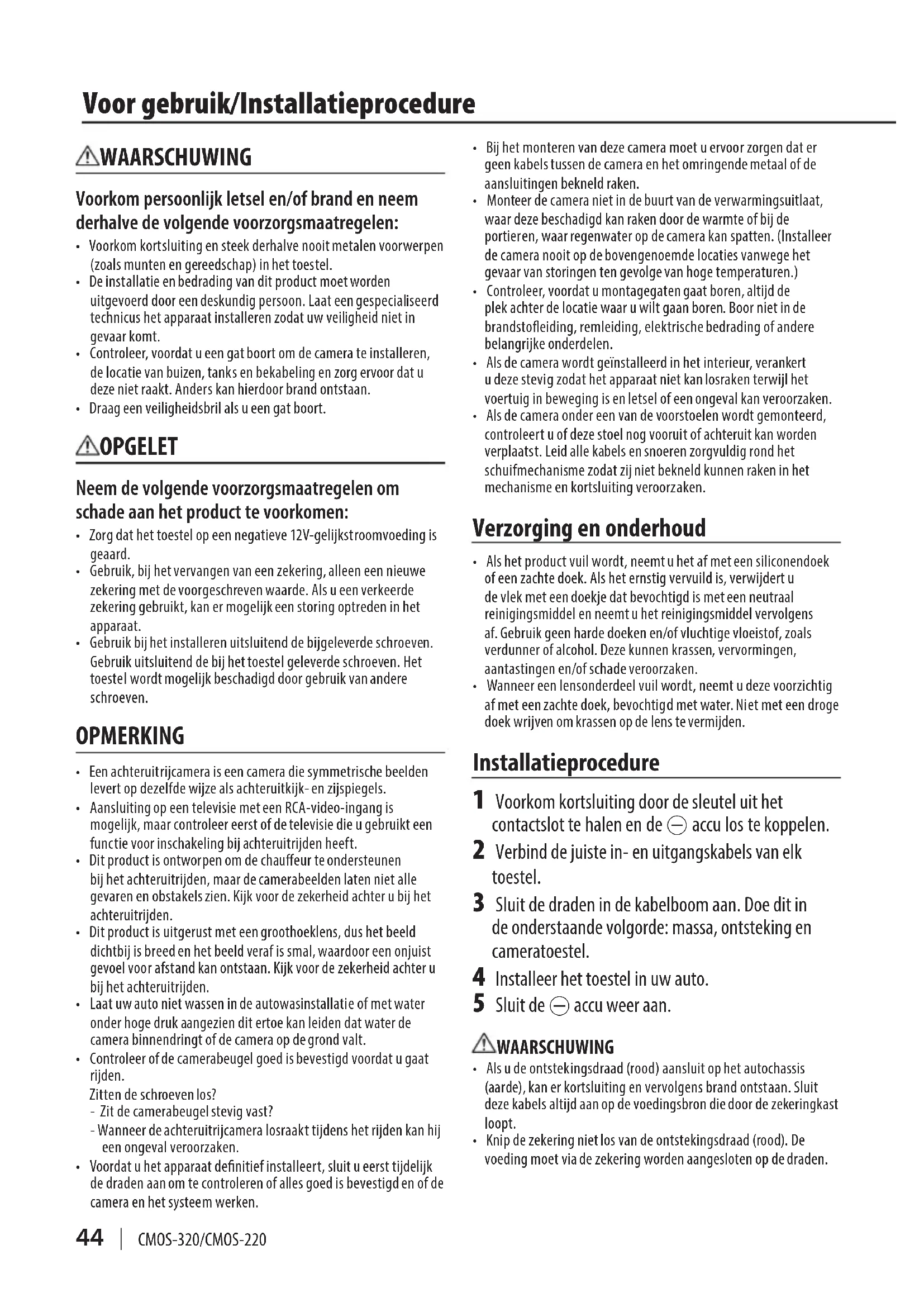 - Voordatuhetapparaatdenitiefinstalleert,sluitueersttijdelijk dedradenaanomtecontrolerenofallesgoedisbevestigdenofde cameraenhetsysteemwerken. Voor gebruik/Installatieprocedure LVT2720-001A.indb 44 14/02/14 15:12CMOS-320/CMOS-220
