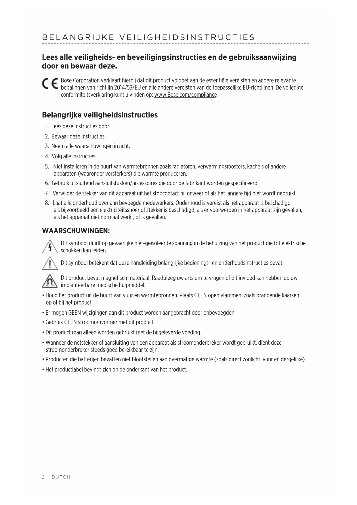 Die Bluetooth®-Anzeige leuchtet blau und Sie hören einen Sprachbefehl zum Auswählen einer Sprache (siehe Seite 16).DEUTSCH - 332 - DUTCH BELANGRIJKE VEILIGHEIDSINSTRUCTIES Lees alle veiligheids- en beveiligingsinstructies en de gebruiksaanwijzing door en bewaar deze. Bose Corporation verklaart hierbij dat dit product voldoet aan de essentiële vereisten en andere relevante bepalingen van richtlijn 2014/53/EU en alle andere vereisten van de toepasselijke EU-richtlijnen. De volledige conformiteitsverklaring kunt u vinden op: www.Bose.com/compliance Belangrijke veiligheidsinstructies