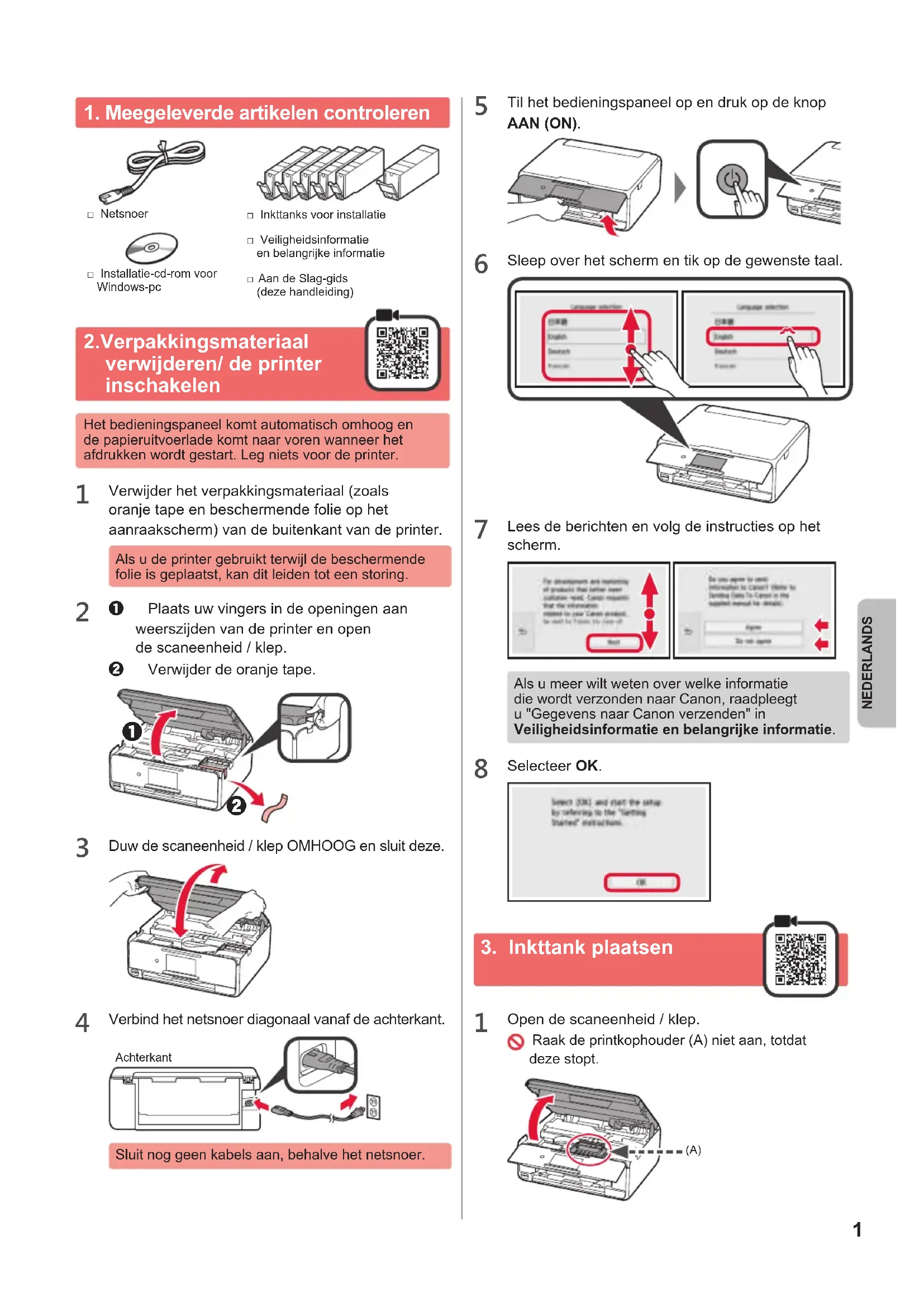 □ Installatie-cd-rom voor Windows-pc□ Netsnoer□ Veiligheidsinformatie en belangrijke informatie□ Inkttanks voor installatie□ Aan de Slag-gids (deze handleiding)