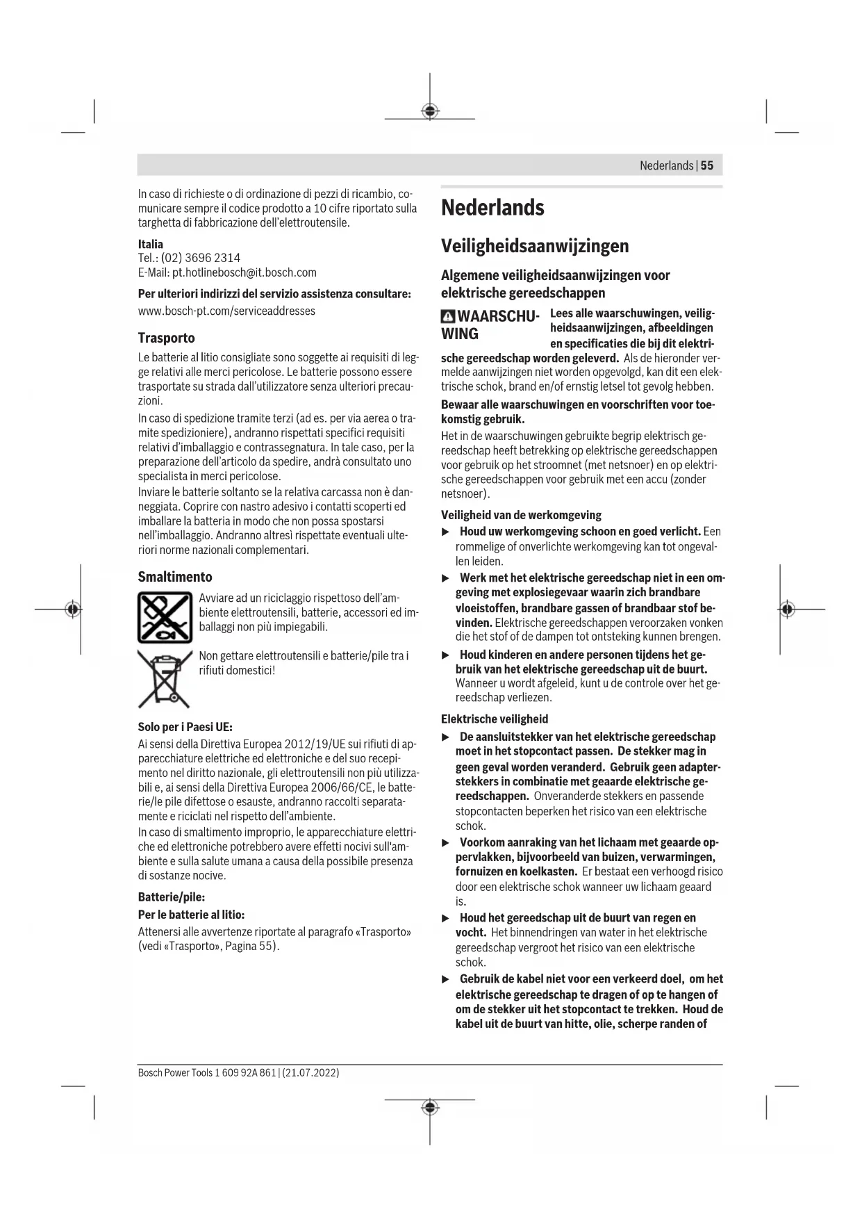 1,5 1,5 Het in deze gebruiksaanwijzing vermelde trillingsniveau en de geluidsemissiewaarde zijn gemeten met eengenormeer- de meetmethode en kunnen worden gebruikt om elektrische gereedschappen met elkaar te vergelijken. Ze zijn ook ge- schikt voor een voorlopige inschatting van de trillings- en ge- luidsemissie. Het aangegeven trillingsniveau en de aangegeven ge- luidsemissiewaarde representeren de voornaamste toepas- singen van het elektrische gereedschap. Wanneer het elek- trische gereedschap echter wordt gebruikt voor andere toe- passingen, met afwijkende inzetgereedschappen of onvol- doende onderhoud, dan kunnen het trillingsniveau en de ge- luidsemissiewaarde afwijken. Dit kan de trillings- en ge- luidsemissie gedurende de gehele arbeidsperiode duidelijk verhogen. Voor een nauwkeurige schatting van de trillings- en ge- luidsemissies moet ook rekening worden gehouden met de tijden waarin het gereedschap uitgeschakeld is, of waarin het gereedschap wel loopt, maar niet werkelijk wordt ge- bruikt. Dit kan de trillings- en geluidsemissies gedurende de gehele arbeidsperiode duidelijk verminderen. Leg aanvullende veiligheidsmaatregelen ter bescherming van de gebruiker tegen het effect van trillingen vast, zoals: onderhoud van elektrische gereedschappen en inzetgereed- schappen, warm houden van de handen, organisatie van het arbeidsproces. Montage u Neem vóór alle werkzaamheden aan het elektrische gereedschap (zoals het uitvoeren van onderhoud of het wisselen van inzetgereedschappen e.d.) en vóór het vervoeren en opbergen altijd de accu uit het elek- trische gereedschap. Bij per ongeluk bedienen van de aan/uit-schakelaar bestaat gevaar voor letsel. Accu opladen u Gebruik alleen de in de technische gegevens vermelde oplaadapparaten. Alleen deze oplaadapparaten zijn af- gestemd op de bij het elektrische gereedschap gebruikte Li-Ion-accu. Aanwijzing: De accu wordt gedeeltelijk geladen geleverd. Om de volledige capaciteit van de accu te verkrijgen, laadt u voor het eerste gebruik de accu volledig in het oplaadappa- raat op. De Lithium-Ion-accu kan op elk moment worden opgeladen zonder de levensduur te verkorten. Een onderbreking van het opladen schaadt de accu niet. De Li-Ion-accu is door de „Electronic Cell Protection (ECP)“ tegen diepontlading beschermd. Als de accu leeg is, wordt het elektrische gereedschap door een veiligheidsschakeling uitgeschakeld. Het inzetgereedschap beweegt niet meer. u Druk na het automatisch uitschakelen van het elektri- sche gereedschap niet meer op de aan/uit-schakelaar. De accu kan anders beschadigd worden. De accu (3) beschikt over twee vergrendelingsstanden die moeten voorkomen dat de accu bij het onbedoeld indrukken van de accu-ontgrendelingstoets (4) uit de machine valt. Zo- lang de accu in het elektrische gereedschap is geplaatst, wordt deze door een veer op de juiste plaats gehouden. Voor het verwijderen van de accu (3) drukt u op de ontgren- delingstoets (4) en trekt u de accu uit het elektrische ge- reedschap. Gebruik daarbij geen geweld. Accu-oplaadaanduiding De groene LED's van de accu-oplaadaanduiding geven de laadtoestand van de accu aan. Uit veiligheidsoverwegingen is het opvragen van de laadtoestand alleen bij stilstaand elektrisch gereedschap mogelijk. Druk op de toets voor de oplaadaanduiding of , om de laadtoestand aan te geven. Dit is ook mogelijk, wanneer de accu is weggenomen. Bosch Power Tools 1 609 92A 861 | (21.07.2022)60 | Nederlands Als er na het drukken op de toets voor de oplaadaanduiding geen LED brandt, dan is de accu defect en moet vervangen worden. Accutype GBA 18V... LED's Capaciteit Permanent licht 3× groen 60−100% Permanent licht 2× groen 30−60% Permanent licht 1× groen 5−30% Knipperlicht 1× groen 0−5% Accutype ProCORE18V... LED's Capaciteit Permanent licht 5× groen 80−100 % Permanent licht 4× groen 60−80 % Permanent licht 3× groen 40−60 % Permanent licht 2× groen 20−40 % Permanent licht 1× groen 5−20 % Knipperlicht 1× groen 0−5 % Zaagblad bevestigen of vervangen u Draag werkhandschoenen bij de montage of het wis- selen van het inzetgereedschap. Accessoires zijn scherp en kunnen bij langer gebruik heet worden. Zaagblad kiezen Een overzicht van geadviseerde zaagbladen vindt u aan het einde van deze gebruiksaanwijzing. Plaats alleen zaagbladen met enkele nokkenschacht (T-schacht). Het zaagblad mag niet langer zijn dan nodig is voor de gewenste zaagsnede. Gebruik voor het zagen van nauwe bochten een smal zaag- blad. Zaagblad bevestigen (zie afbeeldingA) u Reinig de schacht van het zaagblad vóór het bevesti- gen. Een vervuilde schacht kan niet stevig bevestigd wor- den. Schuif het zaagblad (10), met de tanden in zaagrichting, tot het vastklikken in de zaagbladopname (17). De SDS-hendel (11) springt automatisch naar achter en het zaagblad wordt vergrendeld. Duw de hendel (11) niet met de hand naar ach- ter. Anders kunt u het elektrische gereedschap beschadigen. Let er bij het bevestigen van het zaagblad op dat de rug van het zaagblad in de groef van het steunwiel (9) ligt. u Controleer of het zaagblad stevig vastzit. Een los zaag- blad kan uit de zaaghouder vallen en kan u verwonden. Zaagblad uitwerpen (zie afbeeldingB) u Houd het elektrische gereedschap bij het uitwerpen van het zaagblad zodanig dat er geen personen of die- ren gewond worden door het uitgeworpen zaagblad. Draai de SDS-hendel (11) tot aan de aanslag in de richting van de aanraakbeveiliging (13) naar voren. Het zaagblad wordt gelost en uitgeworpen. Glijvoet (zieafbeeldingC) De kunststof glijplaat(6) van de voetplaat(7) vermindert het bekrassen van delicate oppervlakken. Gebruik bij de be- werking van metaal de stalen glijvoet(18). Voor het aanbrengen van de stalen glijvoet(18) schuift u de- ze vanaf de voorkant op de voetplaat(7). De kunststof glijplaat(6) moet worden vervangen, wanneer deze versleten is. Antisplinterplaatje (zie afbeeldingD) Het antisplinterplaatje (19) (accessoire) kan het versplinte- ren van het oppervlak bij 