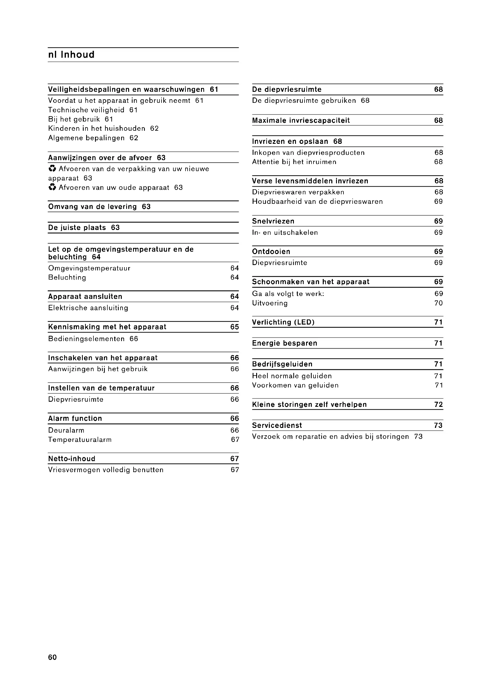 - Afvoeren van uw oude apparaat 63 Omvang van de levering 63 De juiste plaats 63 Let op de omgevingstemperatuur en de beluchting 64 Omgevingstemperatuur 64 Beluchting 64 Apparaat aansluiten 64 Elektrische aansluiting 64 Kennismaking met het apparaat 65 Bedieningselementen 66 Inschakelen van het apparaat 66 Aanwijzingen bij het gebruik 66 Instellen van de temperatuur 66 Diepvriesruimte 66 Alarm function 66 Deuralarm 66 Temperatuuralarm 67 Netto-inhoud 67 Vriesvermogen volledig benutten 67 De diepvriesruimte 68 De diepvriesruimte gebruiken 68 Maximale invriescapaciteit 68 Invriezen en opslaan 68 Inkopen van diepvriesproducten 68 Attentie bij het inruimen 68 Verse levensmiddelen invriezen 68 Diepvrieswaren verpakken 68 Houdbaarheid van de diepvrieswaren 69 Snelvriezen 69 In- en uitschakelen 69 Ontdooien 69 Diepvriesruimte 69 Schoonmaken van het apparaat 69 Ga als volgt te werk: 69 Uitvoering 70 Verlichting (LED) 71 Energie besparen 71 Bedrijfsgeluiden 71 Heel normale geluiden 71 Voorkomen van geluiden 71 Kleine storingen zelf verhelpen 72 Servicedienst 73 Verzoek om reparatie en advies bij storingen 7361 m Veiligheidsbepalingen en waarschuwingen Voordat u het apparaat in gebruik neemt Lees de gebruiksaanwijzing en het installatievoorschrift nauwkeurig door. U vindt daarin belangrijke informatie over plaatsing, gebruik en onderhoud van het apparaat. De fabrikant aanvaardt geen aansprakelijkheid als de aanwijzingen en waarschuwingen in de gebruiksaanwijzing niet in acht worden genomen. Bewaar de gebruiksaanwijzing en het montagevoorschrift voor later gebruik of voor een eventuele latere bezitter. Technische veiligheid Het apparaat bevat een geringe hoeveelheid van het milieuvriendelijke maar brandbare koelmiddel R600a. Let erop dat de leidingen van het koelcircuit bij het transport of de installatie niet beschadigd worden. Koelmiddel dat naar buiten spuit kan vlam vatten of zich ontsteken. Bij beschadiging ▯ Open vuur of andere ontstekingsbronnen uit de buurt van het apparaat houden; ▯ Ruimte gedurende een paar minuten goed luchten; ▯ Apparaat uitschakelen en de stekker uit het stopcontact trekken; ▯ Contact opnemen met de Servicedienst. Hoe meer koelmiddel het apparaat bevat, des te groter moet de ruimte zijn waarin het apparaat wordt opgesteld. In een te kleine ruimte kan bij een lek een ontvlambaar mengsel van gas en lucht ontstaan. Per 8 g koelmiddel moet het vertrek minstens 1 m³ groot zijn. De hoeveelheid koelmiddel in uw apparaat vindt u op het typeplaatje aan de binnenkant van het apparaat. Als de aansluitkabel van het apparaat beschadigd raakt, moet deze worden vervangen door de fabrikant, de klantenservice of een andere gekwalificeerde persoon. Onvakkundige installatie en reparaties kunnen groot gevaar opleveren voor de bezitter. Reparaties mogen uitsluitend worden uitgevoerd door de fabrikant, de klantenservice of een andere gekwalificeerde persoon. Er mogen alleen originele onderdelen van de fabrikant gebruikt worden. Alleen bij deze onderdelen garandeert de fabrikant dat ze aan de veiligheidseisen voldoen. Een verlengsnoer voor de aansluitkabel mag uitsluitend via de klantenservice worden aangeschaft. Bij het gebruik ▯ Nooit elektrische apparaten in het apparaat gebruiken (bijv. verwarmingsapparaten, elektrische ijsmaker etc.). Explosiegevaar! ▯ Het apparaat nooit met een stoomreiniger ontdooien of schoonmaken! De hete stoom kan in de elektrische onderdelen terechtkomen en kortsluiting veroorzaken. Gevaar van elektrische schok! ▯ Gebruik geen puntige of scherpe voorwerpen om een laag ijs of rijp te verwijderen. U kunt hierdoor de koelleidingen beschadigen. Koelmiddel dat naar buiten spuit kan vlam vatten oftot oogletsel leiden. ▯ Geen producten met brandbare drijfgassen (bijv. spuitbussen) en geen explosieve stoffen in het apparaat opslaan. Explosiegevaar! ▯ Plint, uittrekbare manden of laden, deuren etc. niet als opstapje gebruiken of om op te leunen. ▯ Om te ontdooien of schoon te maken: stekker uit het stopcontact trekken resp. de zekering uitschakelen of losdraaien. Altijd aan de stekker trekken, nooit aan de aansluitkabel. ▯ Dranken met een hoog alcoholpercentage altijd goed afgesloten en staand bewaren.62 ▯ Geen olie of vet gebruiken op kunststof onderdelen en deurdichtingen. Ze kunnen poreus worden. ▯ De be- en ontluchtingsopeningen van het apparaat nooit afdekken. ▯ Vermijden van risico's voor kinderen en kwetsbare personen: Kwetsbaar zijn kinderen/personen met lichamelijke, geestelijke of zintuigelijk beperkingen, evenals personen die onvoldoende kennis hebben over de veilige bediening van het apparaat. Zorg ervoor dat kinderen en kwetsbare personen begrijpen wat de gevaren zijn. Een voor de veiligheid verantwoordelijke persoon moet toezicht houden op kinderen en kwetsbare personen bij het apparaat of hen instrueren. Alleen kinderen vanaf 8 jaar het apparaat laten gebruiken. Bij reiniging en onderhoud toezicht houden op kinderen. Laat kinderen nooit met het apparaat spelen. ▯ Flessen en blikjes met vloeistoffen – vooral koolzuurhoudende dranken – niet in de diepvriesruimte opslaan. Flessen en potten kunnen barsten! ▯ Diepvrieswaren nadat u ze uit de diepvriesruimte hebt gehaald, nooit onmiddellijk in de mond nemen. Kans op vrieswonden! ▯ Vermijd langdurig contact van uw handen met de diepvrieswaren, ijs of de verdamperbuizen enz. Kans op vrieswonden! Kinderen in het huishouden ▯ Verpakkingsmateriaal en onderdelen ervan zijn geen speelgoed voor kinderen. Verstikkingsgevaar door opvouwbare kartonnen dozen en folie! ▯ Het apparaat is geen speelgoed voor kinderen! ▯ Bij een apparaat met deurslot: sleutel buiten het bereik van kinderen bewaren! Algemene bepalingen Het apparaat is geschikt ▯ voor het invriezen van levensmiddelen, ▯ voor het bereiden van ijs. Dit apparaat is bestemd voor privégebruik in het huishouden en de huiselijke omgeving. Het apparaat is ontstoord volgens EU richtlijn 2004/108/EC. Het koelcircuit is op dic