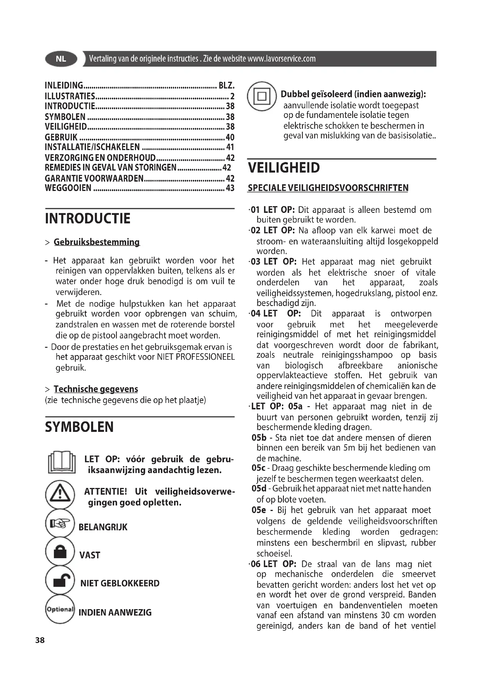 INTRODUCTIE > Gebruiksbestemming - Het apparaat kan gebruikt worden voor het reinigen van oppervlakken buiten, telkens als er water onder hoge druk benodigd is om vuil te verwijderen. - Met de nodige hulpstukken kan het apparaat gebruikt worden voor opbrengen van schuim, zandstralen en wassen met de roterende borstel die op de pistool aangebracht moet worden. - Door de prestaties en het gebruiksgemak ervan is het apparaat geschikt voor NIET PROFESSIONEEL gebruik. > Technische gegevens (zie technische gegevens die op het plaatje) SYMBOLEN LET OP: vóór gebruik de gebru- iksaanwijzing aandachtig lezen. ATTENTIE! Uit veiligheidsoverwe- gingen goed opletten. BELANGRIJK VAST NIET GEBLOKKEERD INDIEN AANWEZIG Dubbel geïsoleerd (indien aanwezig): aanvullende isolatie wordt toegepast op de fundamentele isolatie tegen elektrische schokken te beschermen in geval van mislukking van de basisisolatie.. VEILIGHEID SPECIALE VEILIGHEIDSVOORSCHRIFTEN
