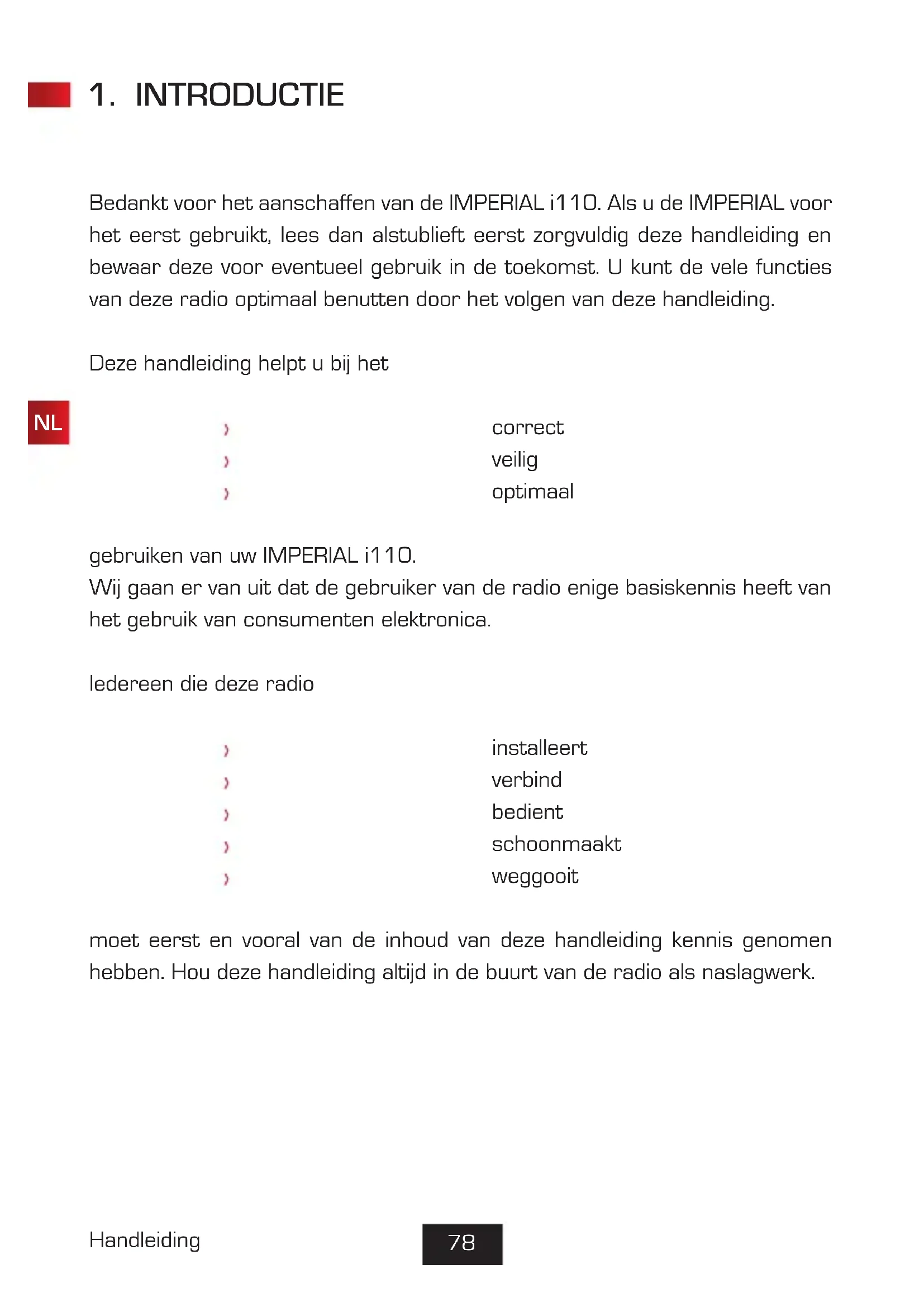Bedankt voor het aanschaffen van de IMPERIAL i110. Als u de IMPERIAL voor het eerst gebruikt, lees dan alstublieft eerst zorgvuldig deze handleiding en bewaar deze voor eventueel gebruik in de toekomst. U kunt de vele functies van deze radio optimaal benutten door het volgen van deze handleiding. Deze handleiding helpt u bij het › correct › veilig › optimaal gebruiken van uw IMPERIAL i110. Wij gaan er van uit dat de gebruiker van de radio enige basiskennis heeft van het gebruik van consumenten elektronica. Iedereen die deze radio › installeert › verbind › bedient › schoonmaakt › weggooit moet eerst en vooral van de inhoud van deze handleiding kennis genomen hebben. Hou deze handleiding altijd in de buurt van de radio als naslagwerk.NL IMPERIAL