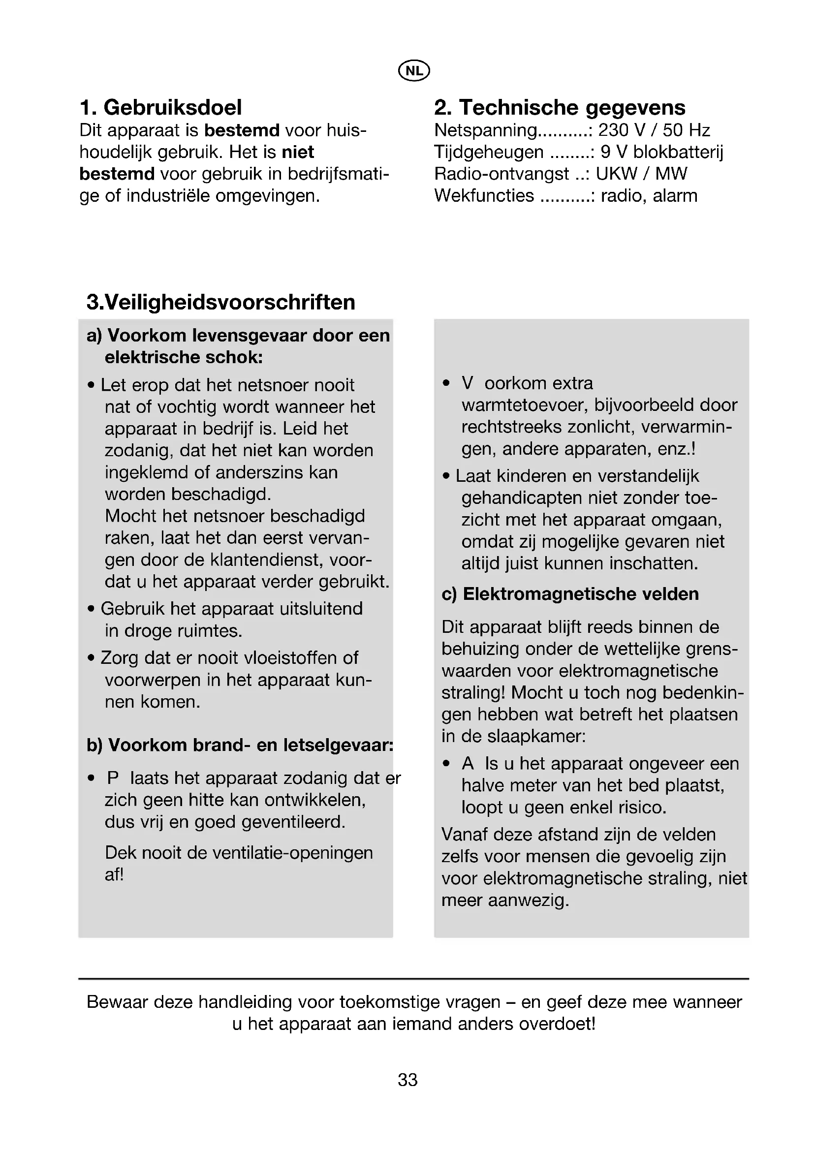 Netspanning..........: 230 V / 50 Hz Tijdgeheugen ........: 9 V blokbatterij Radio-ontvangst ..: UKW / MW Wekfuncties ..........: radio, alarm Bewaar deze handleiding voor toekomstige vragen – en geef deze mee wanneer u het apparaat aan iemand anders overdoet! 3.Veiligheidsvoorschriften a) Voorkom levensgevaar door een elektrische schok: