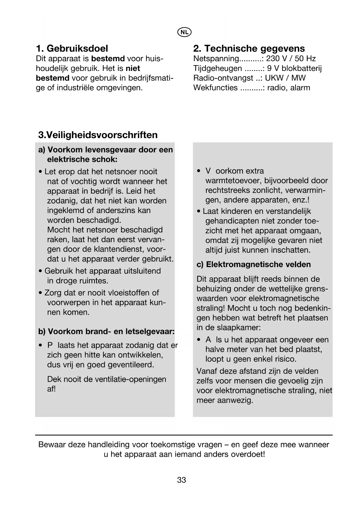Netspanning..........: 230 V / 50 Hz Tijdgeheugen ........: 9 V blokbatterij Radio-ontvangst ..: UKW / MW Wekfuncties ..........: radio, alarm Bewaar deze handleiding voor toekomstige vragen – en geef deze mee wanneer u het apparaat aan iemand anders overdoet! 3.Veiligheidsvoorschriften a) Voorkom levensgevaar door een elektrische schok: