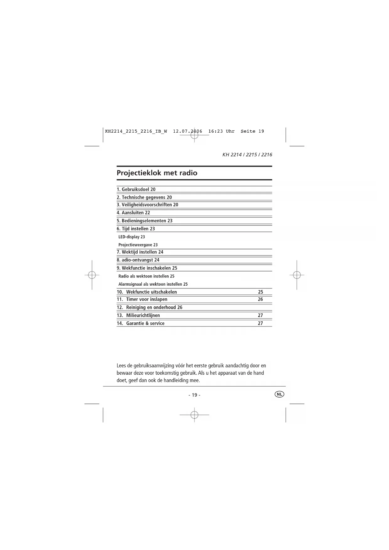 Lees de gebruiksaanwijzing vóór het eerste gebruik aandachtig door en bewaar deze voor toekomstig gebruik. Als u het apparaat van de hand doet, geef dan ook de handleiding mee. KH2214_2215_2216_IB_W 12.07.2006 16:23 Uhr Seite 19KH 2214 / 2215 / 2216