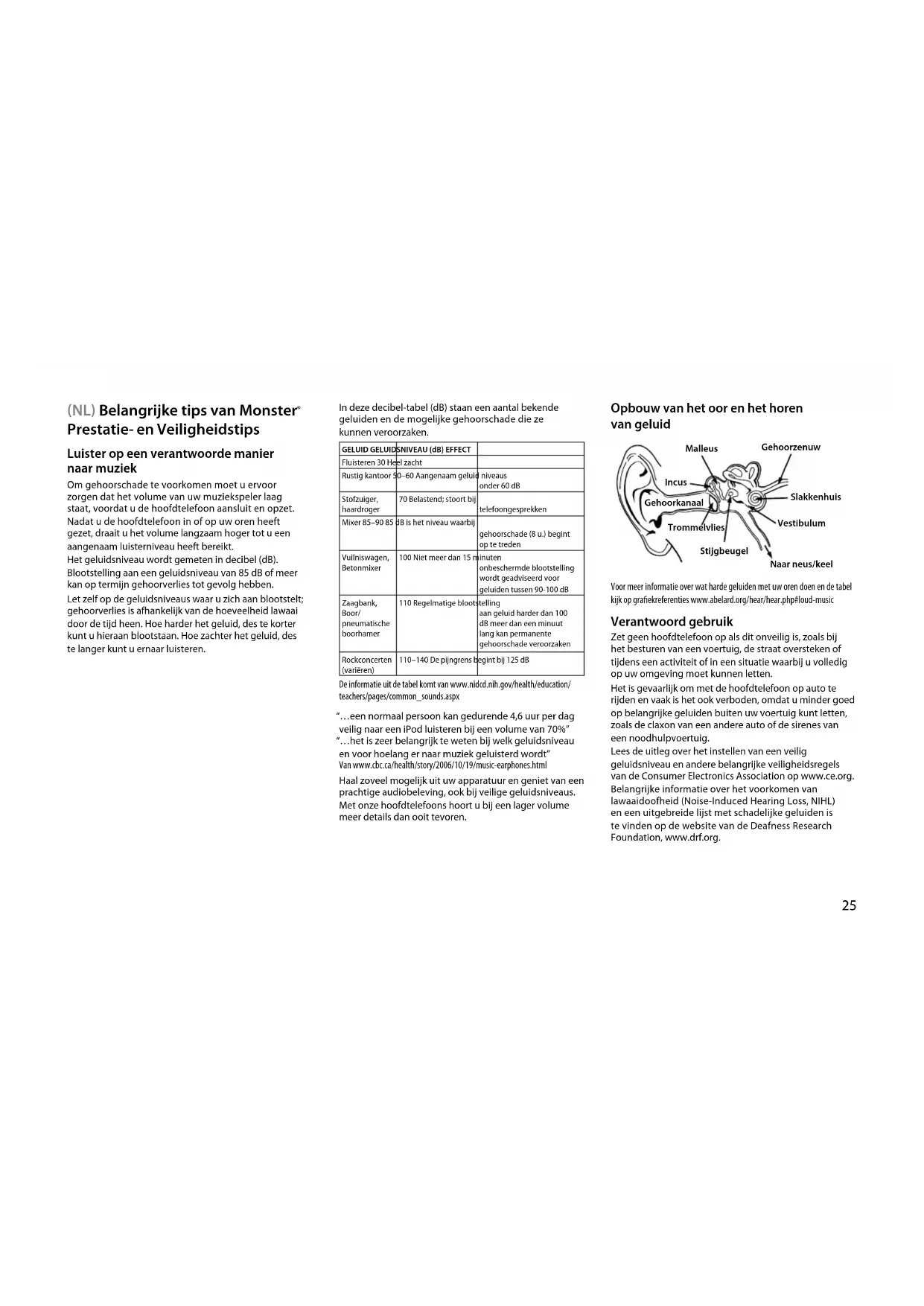 Om gehoorschade te voorkomen moet u ervoor zorgen dat het volume van uw muziekspeler laag staat, voordat u de hoofdtelefoon aansluit en opzet. Nadat u de hoofdtelefoon in of op uw oren heeft gezet, draait u het volume langzaam hoger tot u een aangenaam luisterniveau heeft bereikt. Het geluidsniveau wordt gemeten in decibel (dB). Blootstelling aan een geluidsniveau van 85 dB of meer kan op termijn gehoorverlies tot gevolg hebben. Let zelf op de geluidsniveaus waar u zich aan blootstelt gehoorverlies is afhankelijk van de hoeveelheid lawaai door de tijd heen. Hoe harder het geluid, des te korter kunt u hieraan blootstaan. Hoe zachter het geluid, des te langer kunt u ernaar luisteren.